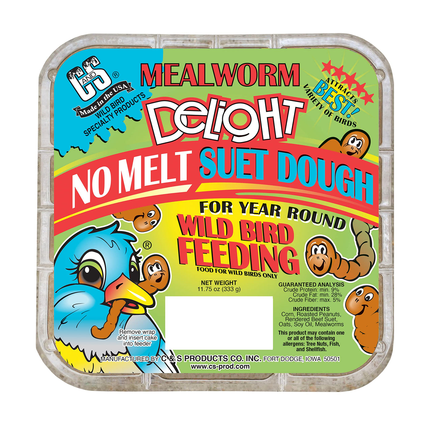 Mealworm Delight Is Blending The Same High Quality Beef Fat With A Base Of Corn Meal And Roasted Peanuts. Other Ingredients Are Added And Mixed Into A Soft Dough Texture And Then Pressed Into A Cake Form. C&S'S Process, Unlike Others Who Pour Their Dough Products Into A Tray, Creates The Only True No Melt Suet Product Line In The World. This Produces Products Unmatched In The Industry For Year Round Feeding In All Types Of Weather. Attracts The Best Variety Of Birds. C&S Products Company Is The Leader In The Wild Bird Suet Market. Since Our Founding In 1986, C&S Wild Bird Feeding Products And Accessories Have Achieved Unprecedented Levels Of Customer Satisfaction And Loyalty. We Take Pride In Our Reputation Of Creating The Highest Quality Products! We Have A Great Team Of Employees That Take Pride In What They Do Every Single Day. We Promise To Continue To Offer Our Customers Products That Give The Best Value And Bird Loving Results!