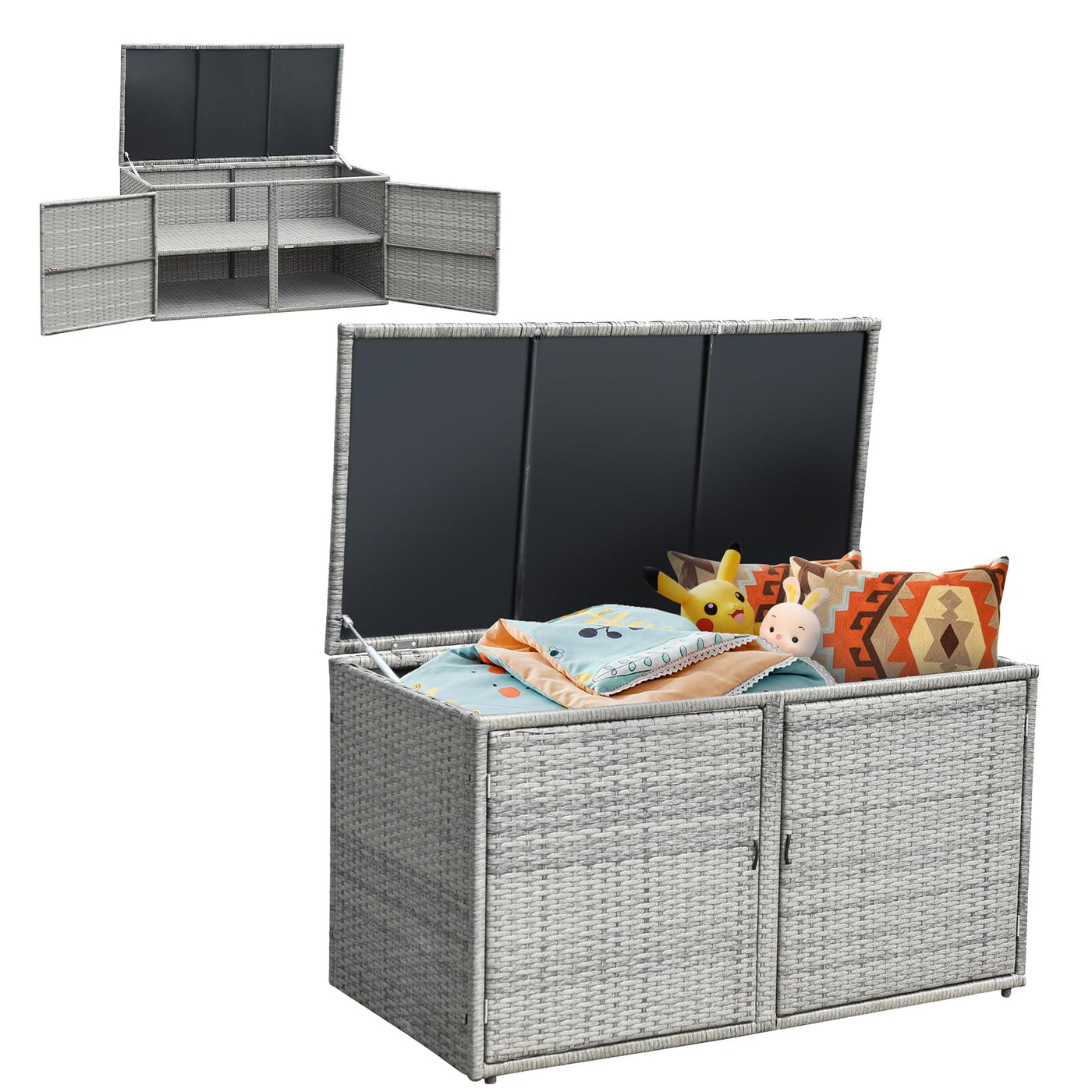 Description This Garden Bench Box Maximizes Storage Space And Increases Patio Seating Capacity While Providing An Attractive Focal Point To Your Garden Or Patio.&Nbsp;It Is Made Of Sturdy Steel,&Nbsp;Pe Wicker And Weather-Proof For Durable Use. When You Lack Space For Storing Your Belongings Outdoors, The Box Will Work Perfectly With Large Capacity For Storing Your Cushions, Cleaning Tools And Other Items. There Are Two Layers In The Box To Help You Make Full Use Of Space. In Addition, It Is Easy To Store Or Take Things Because The Box Can Be Opened At Top Or Front. Feature Heavy-Duty Steel Frame Ensures Sturdiness And Durability Of The Box Tight And Hand-Woven Rattan Can Withstand Moderate Rain Or Wind About 88&Nbsp;Gallons Inner Capacity To Store Different Items 2 Layers Of Inner Space To Make Full Use Of Vertical Space Multiple Ways To Open The Rattan Storage Box Height Of Feet Can Be Adjusted According To Different Ground Condition Multipurpose Storage Box For Patio, Garden And Poolside Convenient To Clean Just With A Wet Cloth Easy To Assemble According To Instruction Specification Material: Rattan, Steel Color: Gray Dimension&Nbsp;Of Closing Box: 45 X&Nbsp;23.5 X&Nbsp;25.5 &Nbsp;(L&Nbsp;X&Nbsp;W&Nbsp;X&Nbsp;H) Dimension&Nbsp;Of Fully&Nbsp;Open&Nbsp;Chair: 85 X&Nbsp;23.5 X&Nbsp;48 &Nbsp;(L&Nbsp;X&Nbsp;W&Nbsp;X&Nbsp;H) Height Of Shelf: 10.5 Weight Of Box: 36.5 Lbs Load&Nbsp;Capacity&Nbsp;Of Shelf:&Nbsp;110 Lbs Why You Choose This Rattan Storage Box? &Nbsp;Sturdy, Well Constructed And&Nbsp;Easy To Assemble. &Nbsp;Nice Outside Storage Solution.