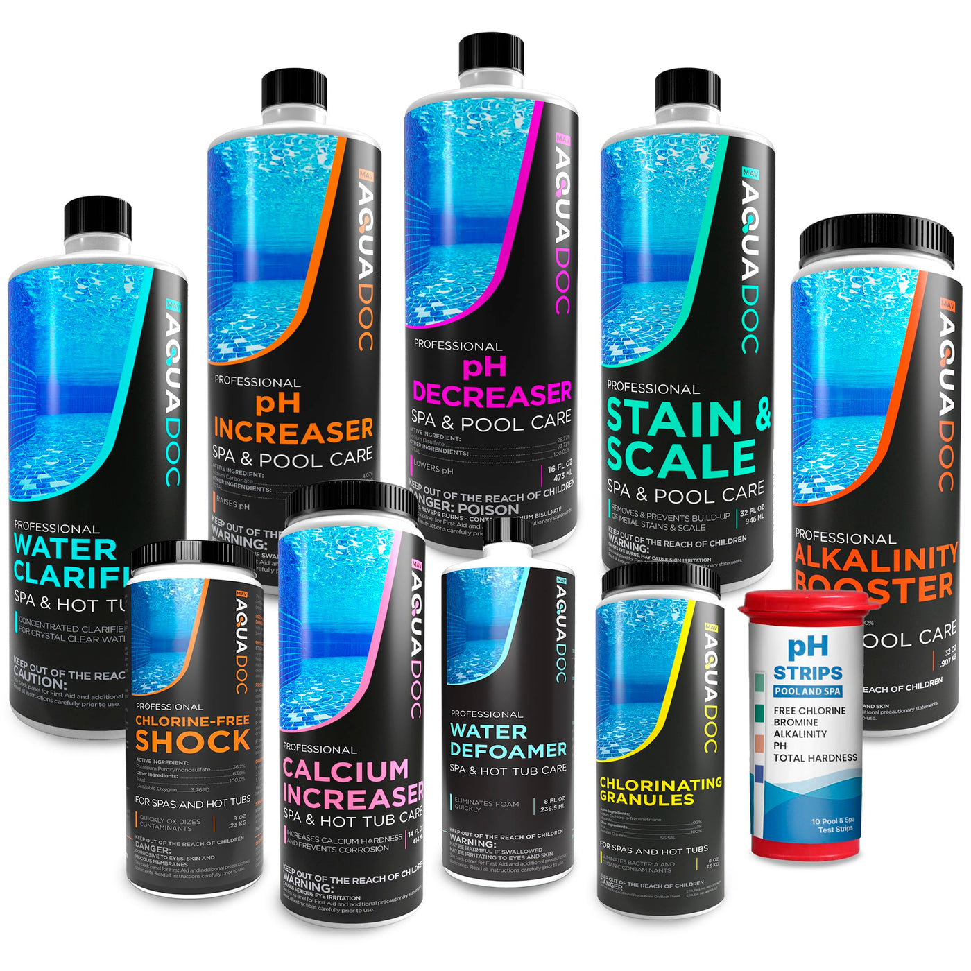 If You Own A Spa Or Hot Tub, Keeping The Water Clean And Balanced Is Essential For Your Health And Enjoyment. With The Aquadoc Spa Water Test Kit, You Can Test The Chlorine Levels And Ph Balance Of Your Spa Water Quickly And Easily. This Kit Includes Everything You Need To Start, Including Test Strips And Detailed Instructions. Effective Spa Chlorine Test Kit Chlorine Is The Foundation Of Any Swimming Pool Or Spa, And It'S Crucial To Keep Levels Balanced To Maintain A Clean And Pleasant Environment. This Spa Water Test Kit Takes All Of The Guesswork Out Of Keeping Your Spa In Perfect Balance, With Easy-To-Use Test Strips, Ph Increase And Decrease Chemicals, And Immediate Results. Keep Your Spa Looking And Feeling Its Best With This Essential Kit! Premium Hot Tub Maintenance Kit Are You Looking For A Convenient Way To Maintain Your Spa Or Hot Tub? This High-Quality Aquadoc Kit Includes Everything You Need To Keep Your Spa Water Sparkling, Including A Fast-Acting Chlorine, Spa Clarifier, Calcium Booster, And Cleaner. Our Spa Water Test Kit Will Help Prevent Surface Corrosion And Damage To Your Equipment With Regular Use. Order Yours Today And Enjoy Peace Of Mind Knowing That Your Spa Or Hot Tub Is Properly Maintained! All-Inclusive Spa Ph Balance Kit Whether You'Re A First-Time Spa Owner Or A Seasoned Pro, This Hot Tub Ph Balance Kit Is A Must-Have For Keeping Your Spa Water Clean And Balanced. This Startup Bundle Includes Spa Chlorine Granules To Keep Your Inflatable Hot Tub Water Clear. Each Spa Maintenance Kit Also Includes Metal-Free To Prevent Metal Staining And Corrosion. The Clear & Sparkle Solution Serves As A Fast-Acting Clarifier To Remove Dirt And Oils, While The Foam-Free Eliminates Annoying Foam From Your Spa. This Hot Tub Ph Balance Kit Comes With Specialty Chemicals To Increase Ph, Reduce Ph, Increase Calcium, Re-Energize, And Clean.