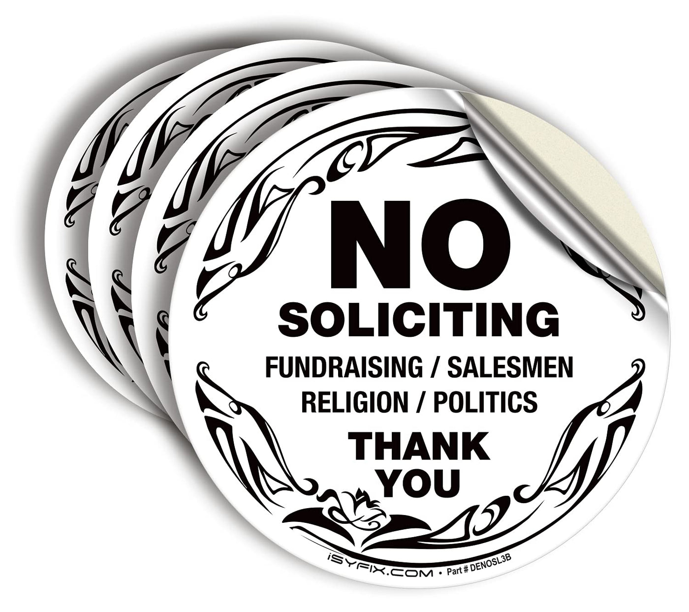 A Inexpensive Solution To Annoying Problem!!! Prevent Unwanted Solicitors From Disrupting Your Work And, Worse, Harassing Your Guests And Employees. The Signs Helps You To Prevent Strangers Ringing The Doorbell, Decrease The Unwanted Traffic And Diminished The Influx Of Solicitors Coming To Your Home. Premium Quality Waterproof, Weatherproof, Scratch And Uv Resistant Overlaminate Isyfix Have Designed This Warning Sticker With Lg Hausys High Performance Grade Vinyl, And Printed With Long-Lasting Inks With And Added Uv Glossy Protective Overlaminate To Create A Waterproof, Weatherproof, Scratch And Uv Resistant Decals That Will No Fade And Last For Many Years. How To Install We Recommend You To Thoroughly Clean The Substrate To Remove Any Dust, Grease, Or Silicone Before Applying The Adhesive. Works Great On Flat Surfaces Such As Your Window, Wall, Door, Or Mailbox. After The Purchase, We Will Send You An Email With An Attached Pdf Containing The Install Instructions. What You Will Receive Includes: 4 Pcs Of No Soliciting Stickers Has Black Letters And White Background And Glossy Finish, Size: 5 Inches Width X 5 Inches Height.