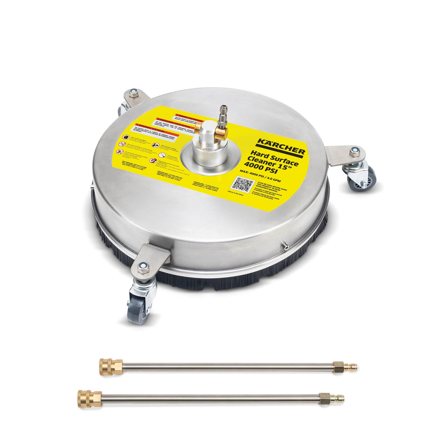 The New Karcher 15' Metal Surface Cleaner Works In Tandem With Your Gas Pressure Washer (Up To 4000 Psi) To Quickly Deliver Professional Level Cleaning Without Splash Back. It Cleans An Area 15' Wide With Two Spinning Nozzles Instead Of One, Reducing Your Cleaning Time, & Eliminates Streaks By Keeping The Nozzles At A Fixed Height From The Surface. Also Cleans Vertical Surfaces Including Garage Doors & Home Siding. Quick Connect For Compatibility With A Wide Range Of Electric Pressure Washers. Get Pro Cleaning Results With The Help Of Karcher 15' Surface Cleaner.