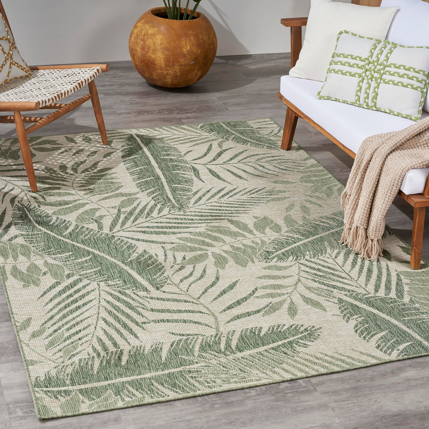 Tropical With A Touch Of Modern, The Garden Oasis Collection Of Outdoor Rugs Transforms Any Space Into A Breezy Retreat. With A Modern Color Palette And Low-Maintenance Construction, These Flat Weave Rugs Are Built For Performance But Dont Sacrifice Style. The Lightweight Construction Lays Flat Quickly And Doesnt Shed, So You Can Spend Less Time Waiting For Your Space To Come Together And Get Right To Relaxing With Friends And Family. Enjoy Vacation Vibes From The Comfort Of Your Backyard With This Ivory And Green Outdoor Rug From The Garden Oasis Collection. The Oversized Tropical Leaf Pattern Evokes Feelings Of Lounging By The Beach, With Subtle Tonal Variations That Add Rhythmic Appeal. Machine-Made From Polypropylene Yarns For Lasting Style And All-Weather Performance, This Flatweave Rug Is Great For Both Indoor And Outdoor Spaces.