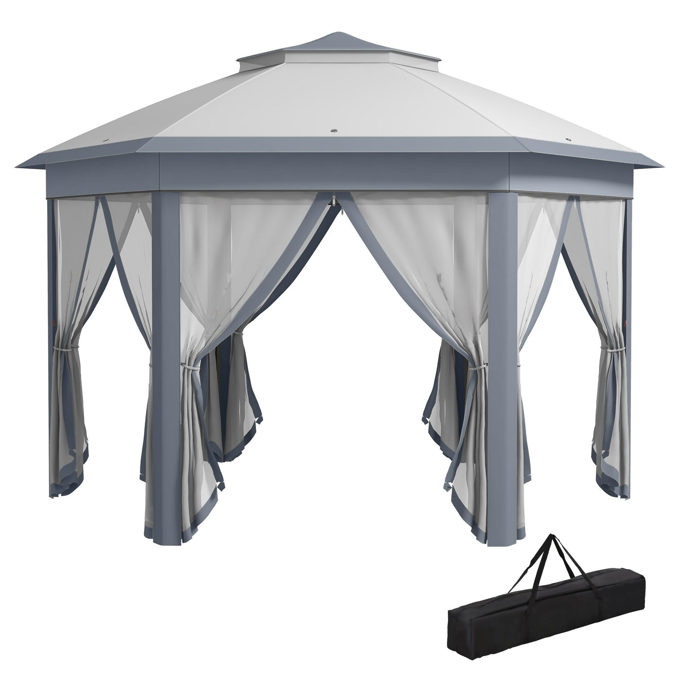 Description:Outsunny'S 13' Small Canopy With Mesh Sidewalls Is Great For Family Parties, Weddings, Picnics, Sporting Events, Outdoor Vending, Craft Fairs, Camping Trips, And More. This Portable Gazebo Features A Solid Steel Frame And Six Mesh Sidewalls For Ventilation And Protection. With A Steel Frame, You Know This Screened Canopy Will Last You From Event To Event For Years To Come. Furthermore, The Outdoor Tent Screen House Comes With A Carry Bag For Easy Transport And Storage.Features:- Hexagon Hot Tent With 6 Mesh Sidewalls For Patio, Deck, Or Garden - Powder-Coated Steel Construction, Anti-Rust - Water-Resistant, Uv-Blocking Polyester Cover - Netting Keeps Unwanted Guests Out While Allowing Cool Breezes - Drainage Eye Holes On The Top Cover For Water Runoff - Includes 6 Pull Ropes And 12 Stakes For Anchoring - Pop-Up Design For Easy Assembly Note: Please Fold It Up When Not In Use And Do Not Leave It In Reverse Weather.Specifications:- Color: Gray - Material: Steel, Polyester, Mesh - Corner To Corner Size: 13.3' - Side To Side Size: 11.2' - Hexagon Side Length: 6' - Eave Height: 6.6' - Top Height: 9.4' - Column Spacing: 5.7' Note: Not To Be Left Up During Adverse Weather Or Inclement Weather Conditions Which Includes Rain, Snow, Sleet And Hail As They Will Add Weight That Can Cause The Tent To Collapse.Package Includes:? 1 X Pop Up Canopy ? 12 X Ground Stake ? 6 X Pull Ropes ? 6 X Triangle Rings ? 6 X Buckles ? 1 X Carry Bag ? 1 X Manual