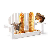 Solution4Patio White Bench Chair Chipmunk & Squirrel Feeder, Mesh Bottom, 2 Corn Cob Holders, Peanut Or Acorn Loader, Solid Pine