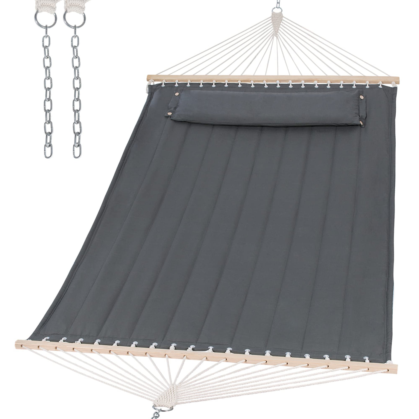 Suncreat Double Quilted Hammock With Hardwood Spreader Bar, Extra Large Soft Pillow, Heavy Duty 2 Person Hammock For Indoor, Outdoor, Gray