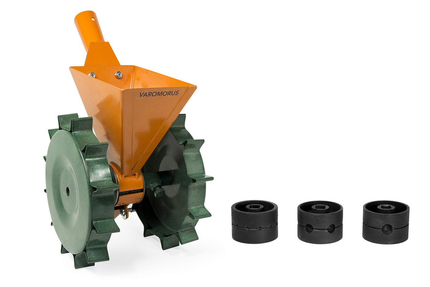 Varomorus Corn Beans Vegetable Metal 2-Row Manual Seeder Onion Radish Beets The Manual Seeder Is Designed For Row Sowing Cereal And Vegetable Seeds In Greenhouses, Open Land, And Household Plots. This Is A Pull-Behind Style Manual Seeder. Take The Handle And Pull The Seeder Behind You. How Does It Work? The Seeder'S Main Function Is Based On The Rotation Of The Sowing Drum (8). The Crop Seeds Pass Into Its Calibrated Recesses. The Limiter Brush Allows Seeds (One Or More Depending On Size) Into Each Recess Of The Sowing Drum. Seeds Are Then Thrown Down Into The Furrow By The Flip-Out Ejector Of The Original Construction. The Sowing Density Depends On The Space Between Recesses In The Sowing Hub And The Regulation Of The Limiter Brush. Technical Specifications: A Built-Up Module Design. A Stamped Steel Profile. 2 Simultaneously Operated Rows. The Width Of The Guard Is 60 Mm. - Height - 10 Inches / 250 Mm. - Length - 22 Inches / 560 Mm. - Width - 7,5 Inches / 190 Mm. - Weight - 7,7 Lbs / 3,5 Kg Material: Metal Comes With 3 Nozzles: 12/3 Carrot, Onion, Salad, Spinach, Parsley, Dill, Pepper, Greens. Step: 4-5 Cm.: 6/8 Peas, Soy, Beans. Step: 10-12 Cm.: 1/9 Corn. Step: 45-47 Cm.: