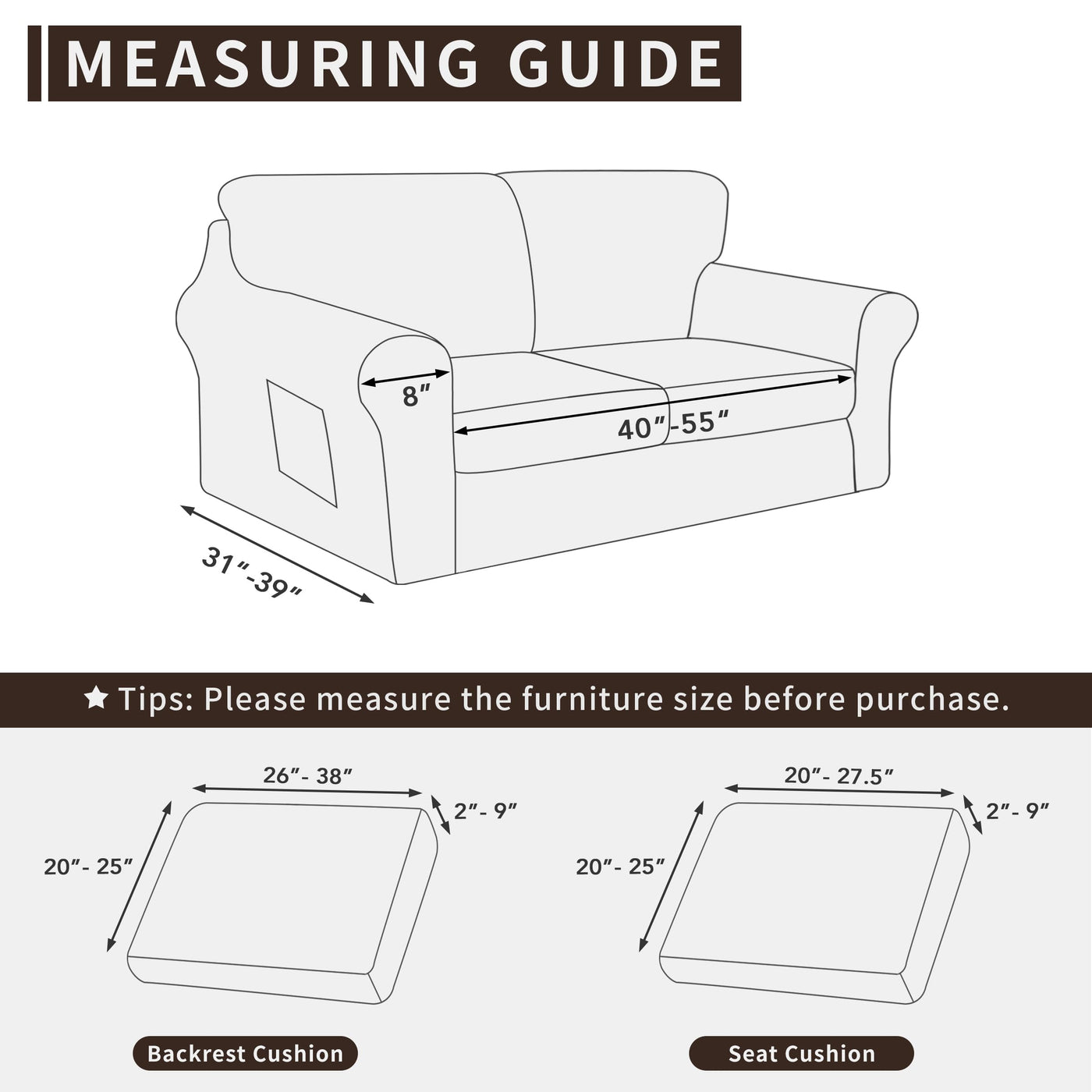Easy-Going Global Sofa Cover Professional Manufacturer! The Factory Is Dedicated To Developing And Producing High-Quality Home Textile Products For Ten Years. Our Goal Is To Make Life More Comfortable And Convenient. Item: Loveseat Cover Set Fabric: 15% Spandex + 85% Polyester, Stretch Fabric, Soft Material, Comfortable And Wrinkle Resistant. Package: One Package Includes 5 Pieces 4 Sizes In Available: Small(25''-35'' Width), Medium (40''-55'' Width), Large (60''-85'' Width) And X-Large (78''-100'' Width). The Backrest Cushion Size: 26''-38'' Length, 20''-25'' Width, 2''-9'' Thickness. The Seat Cushion Size: 20''-27.5'' Length, 20''-25'' Width, 2''-9'' Thickness.Please Refer To The Guide In The Picture For More Details. Features: 1.Unique Combination Of The Slipcover Sets, Which Include Sofa Cover, Cushion Cover And Backrest Cover. Easy To Install And Remove. 2.Provide All-Round Protection, And Will Not Cause Slipping And Wrinkles, To Protect Your Furniture From Stain, Spill, Daily Wears And Tears. 3.Machine Washable, Mild Laundry Detergents Are Advised. Please Do Not Bleach Or Iron.