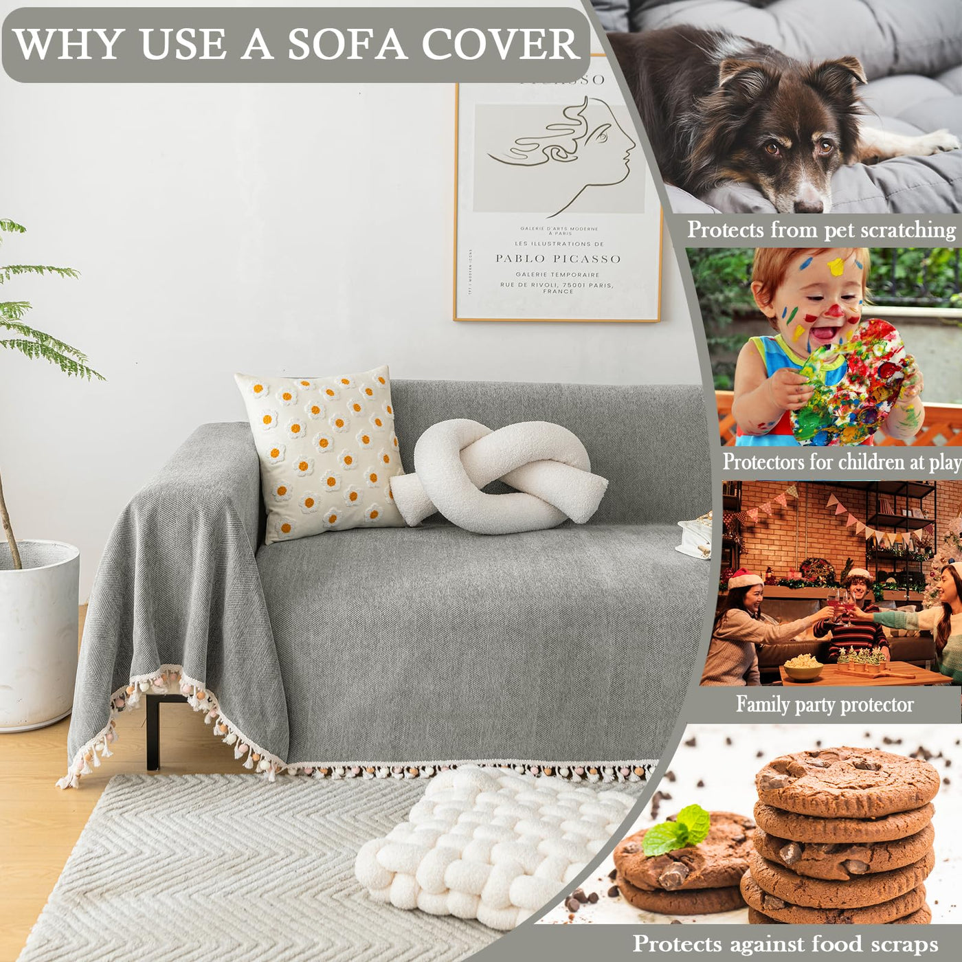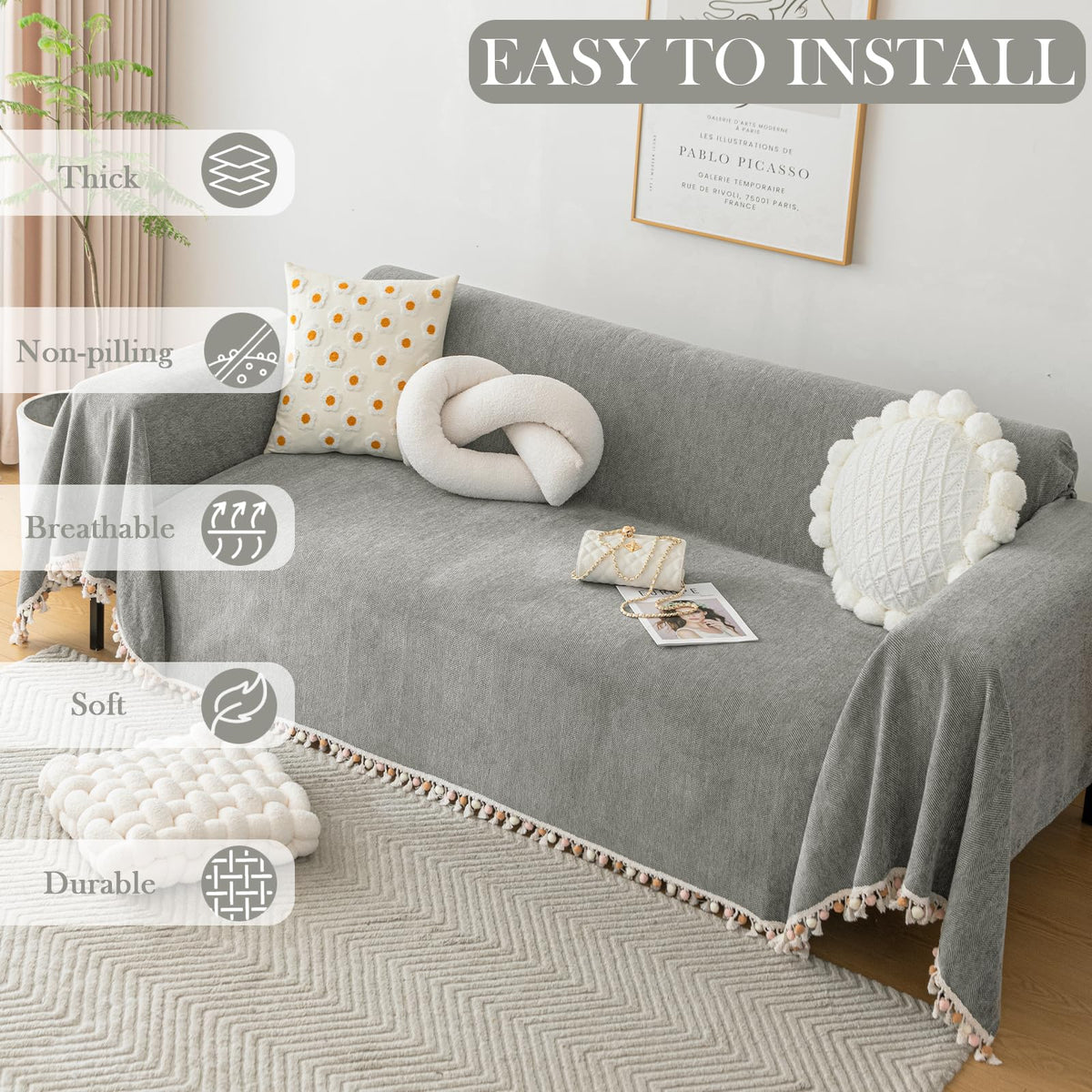 Handontime Couch Slipcovers For Sofas Dark Grey Couch Cover Sofa Cover For Dogs Boho Pet Couch Protector With Tassel Couch Throw Cover Chenille Herringbone Couch Cover Sofa 2 3 Seat Cover, 71' X134'