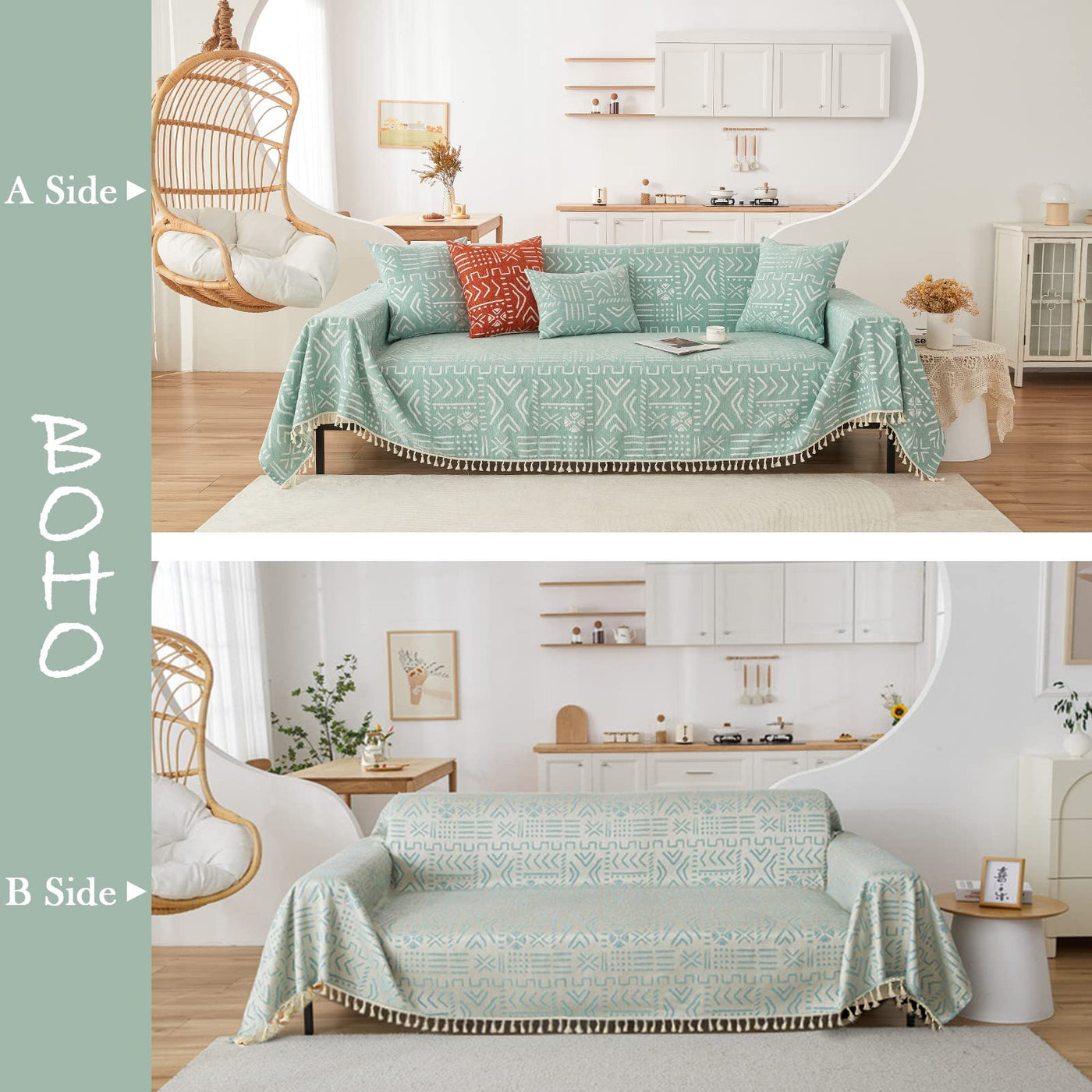 Handontime Farmhouse Couch Cover Tassel Light Green Sofa Covers For Dogs Boho Décor Geometric Aztec Couch Cushion Cover Sofa Protector Cover Sectional Couch Covers For 3 Cushion Couch, 71' X150'