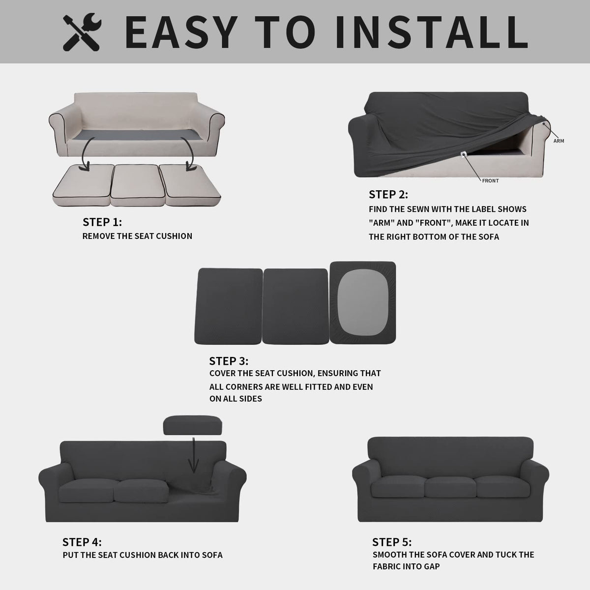 Q: How do I install the ISSUNTEX sofa slipcover?A: Installing the ISSUNTEX sofa slipcover is quick and easy. Simply follow the installation guide, and you can complete the process within 10 minutes by yourself. Just slip it on, tuck in the extra fabric, and place the cushion covers into their respective seat cushions.