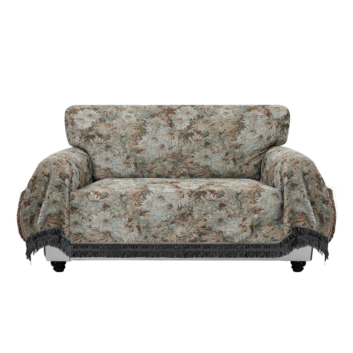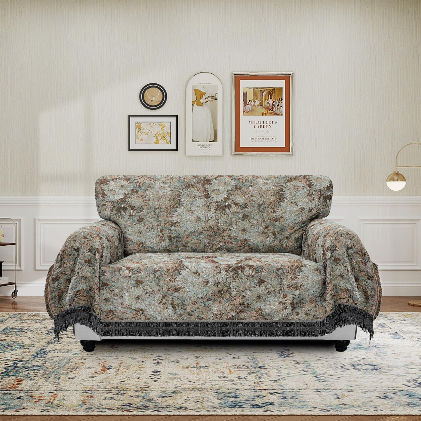Purefit Geometric Jacquard Throw Sofa Cover - Textured Soft Washable Decorative Couch Covers For 3 Cushion Couch, Throw Cover With Tassels Furniture Protector For Pets, Kids (Medium, Flower Sage)