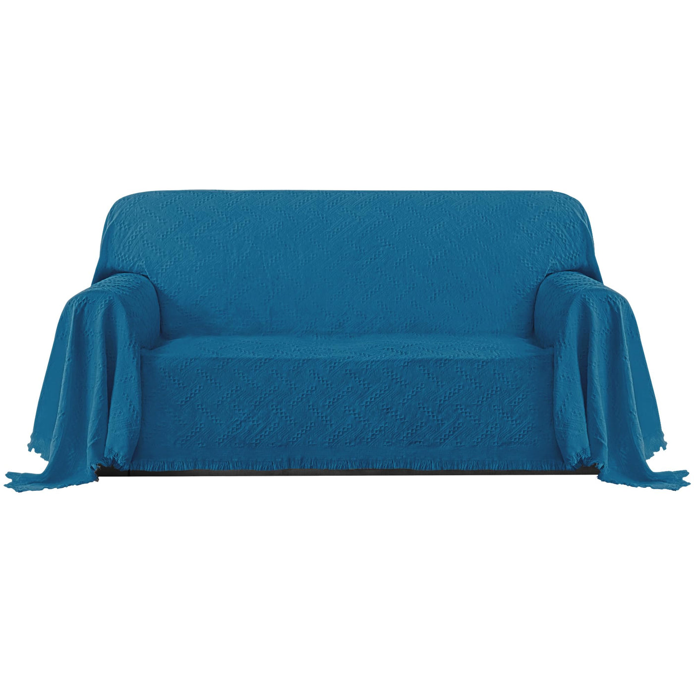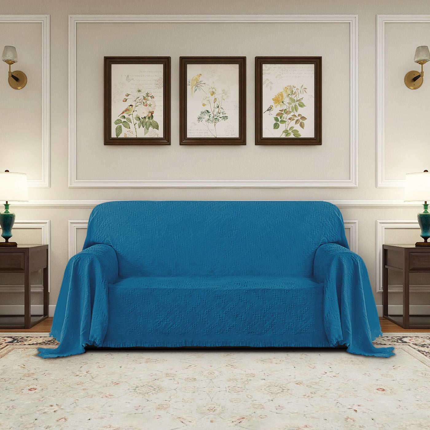 Purefit Geometric Jacquard Throw Sofa Cover - Textured Soft Washable Decorative Couch Covers For 3 Cushion Couch, Throw Cover With Tassels Furniture Protector For Pets, Kids (Medium, Peacock Blue)