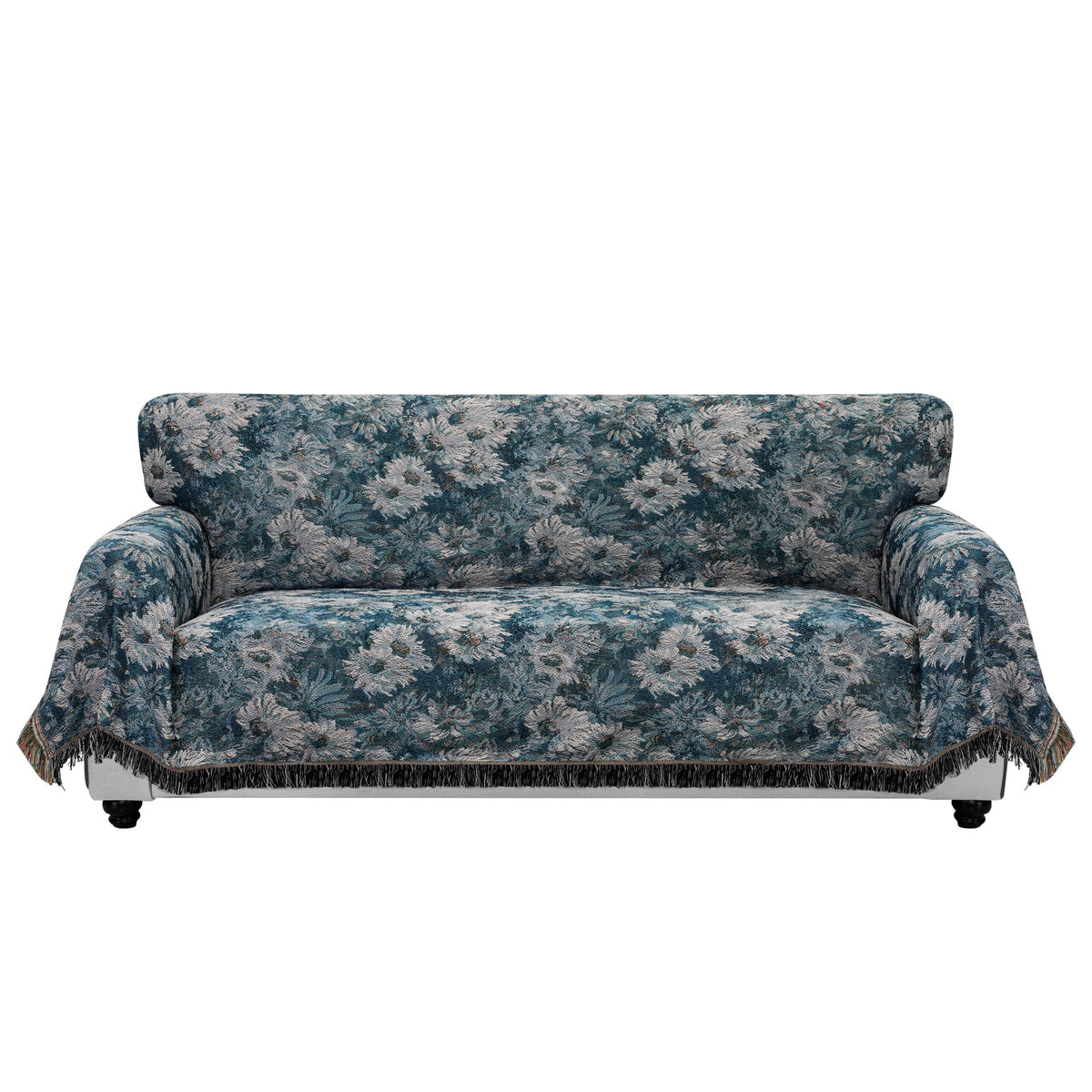 Purefit Geometric Jacquard Throw Sofa Cover - Textured Soft Washable Decorative Couch Covers For 3 Cushion Couch, Throw Cover With Tassels Furniture Protector For Pets (Large, Flower Peacock Blue)