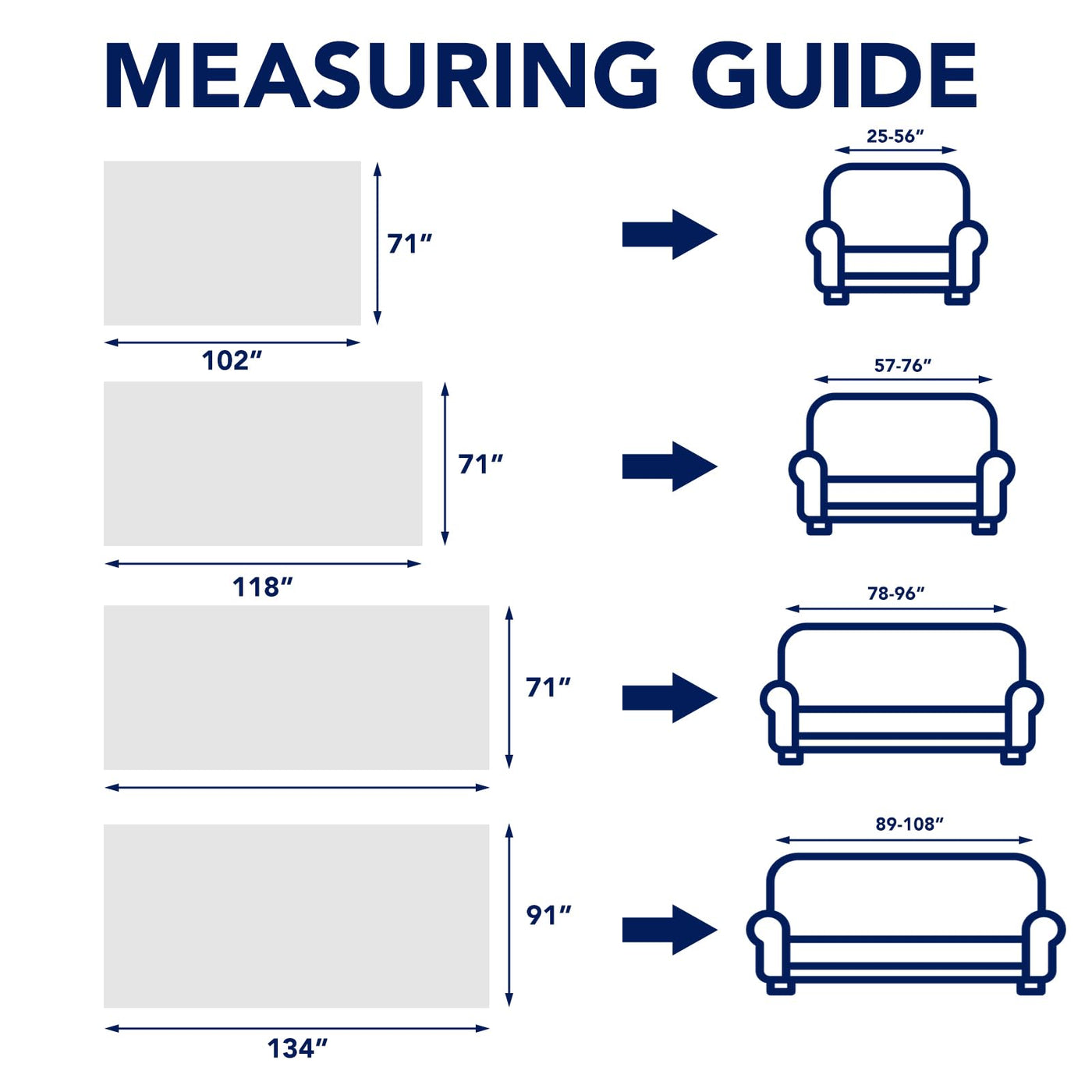 Our sofa throw covers are designed and ready-made to fit a variety of sofa sizes, X-Large: 91'x134', Large: 71'x134', Medium: 71'x118', Small: 71'x102', provides the perfect coverage (including over the arms) of for your sofa.