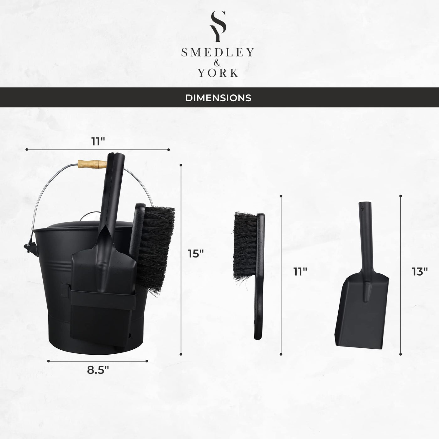 Q: Does the ash bucket come with any additional tools?A: Yes, the Smedley & York Black Ash Bucket includes a fire pit shovel (13 inches) and a hand broom (11 inches) for easy cleanup and maintenance of your fireplace.