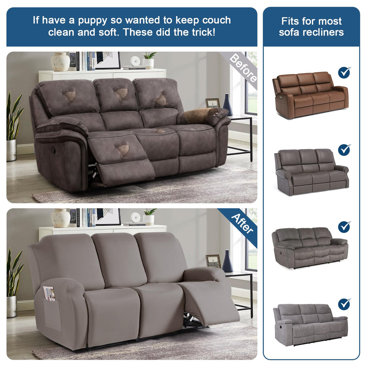 Q: What material are the TAOCOCO sofa covers made of?A: The TAOCOCO Stretch Recliner Sofa Covers are crafted from a high-quality polyester blend, which makes them soft, comfortable, and durable. This material provides excellent protection for your furniture while ensuring comfort during use.