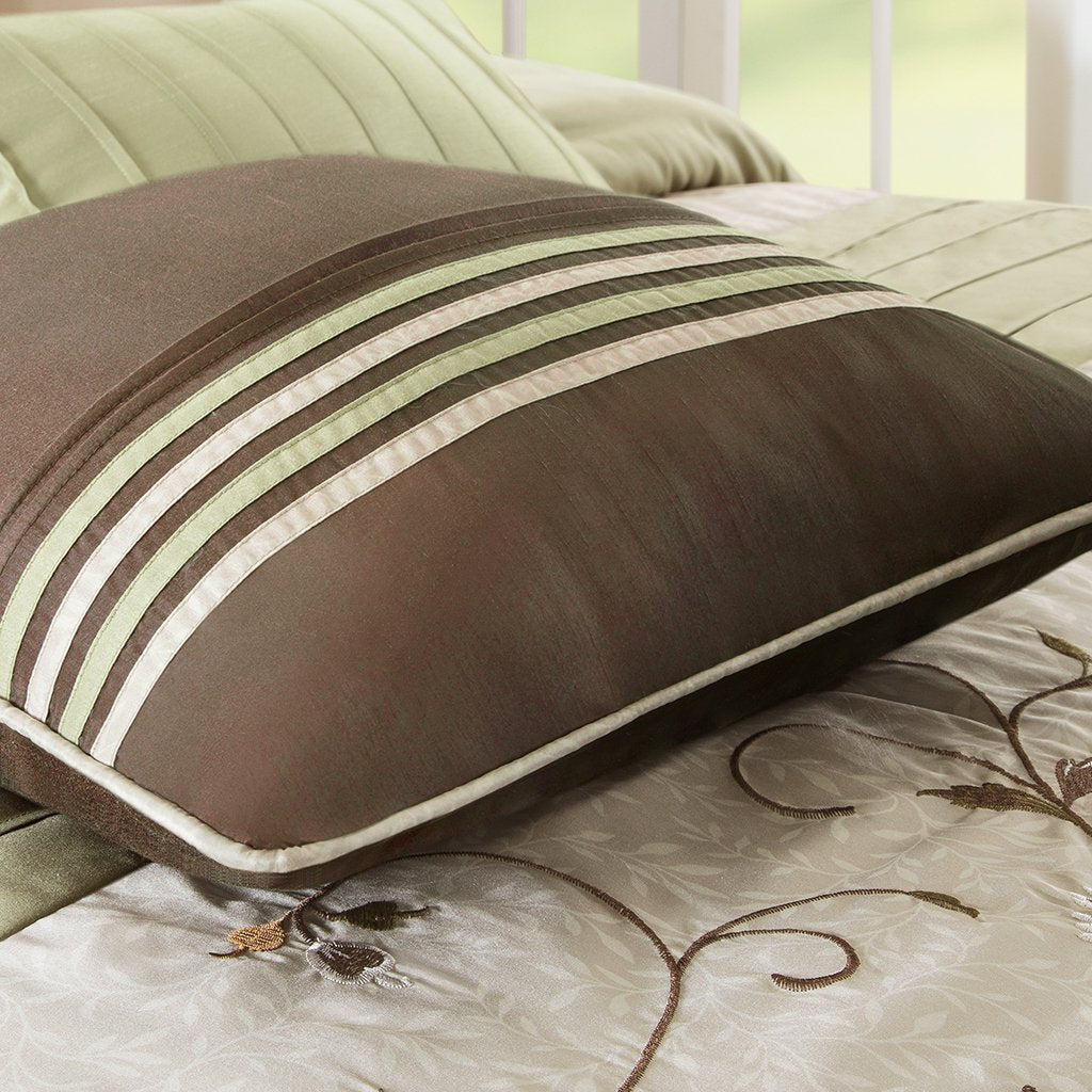 The Serene Bedding Collection provides an elegant look to your home. The top of the comforter is a mix of green, chocolate brown, and taupe with piecing details while the taupe section has an embroidered floral pattern for a soft divide from these bold colors. Made from polyester dupioni, this fabric will produce a shine and pick up the light on both the comforter and shams. The decorative pillows come in a combination of solids, stripes, and embroidery to pull this whole set together.