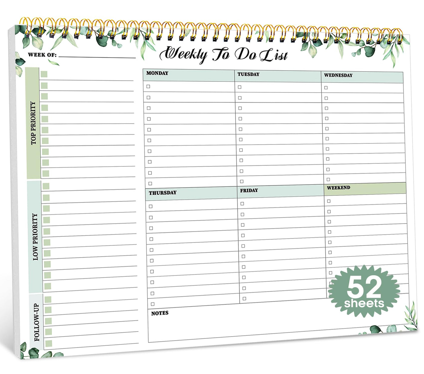 Taja'S Spiral Weekly To Do List Planner Notepad Is Your Ultimate Tool For Staying Organized, Focused, And On Top Of Tasks. Whether You'Re A Busy Professional, A Student, Or A Homemaker, This Compact Notepad Is Designed To Help You Manage Your Weekly To-Do Lists Effectively. With Multiple Sections For Priority Setting, Follow-Up Tracking, And Daily Planning, You Can Easily Prioritize Tasks, Monitor Progress, And Plan Your Days With Ease. The Undated Palnner Provide The Flexibility To Start Anytime, Ensuring No Wasted Space Or Skipped Dates. Whether You'Re At Home, In The Office, Or On The Go, Taja'S Weekly Planner Is Your Reliable Companion. The Compact Size Makes It Perfect For Carrying In Your Bag Or Placing On Your Desk. Use It To Manage Work Projects, Academic Assignments, Household Chores, Or Personal Goals. The Premium Water-Proof Cover, Twin-Wire Binding, And Sturdy Cardboard Backing Ensure Durability And Provide A Stable Writing Surface. The Thick 100Gsm Paper Prevents Ink Bleeding, So You Can Jot Down Your Tasks Without Worry. Stay Organized, Accomplish Your Goals, And Make Each Week A Success With Taja'S Weekly To Do List Notepad. It'S The Perfect Tool To Streamline Your Tasks And Keep You On Track, No Matter Where Life Takes You. Product Highlights Size:8.5 X 11' Inches Pages:52 Non-Bleed 100Gsm Paper Cover:Double Spiral Bound Designed To Easily Turn Over The Pages Printed On Thick Non-Bleed Paper