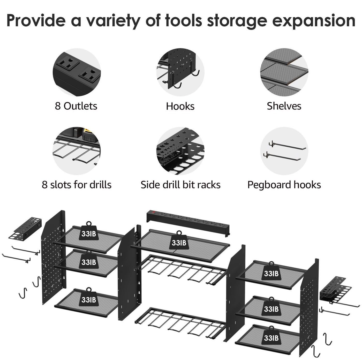 Cccei Black Large Tools Organizer Wall Mount Charging Station, 39 Inch Long Power Tool Battery Storage Rack With 10Ft Power Strip. 8 Drill Holder, Garage Utility Shelves. Pegboard Hanging Extension.