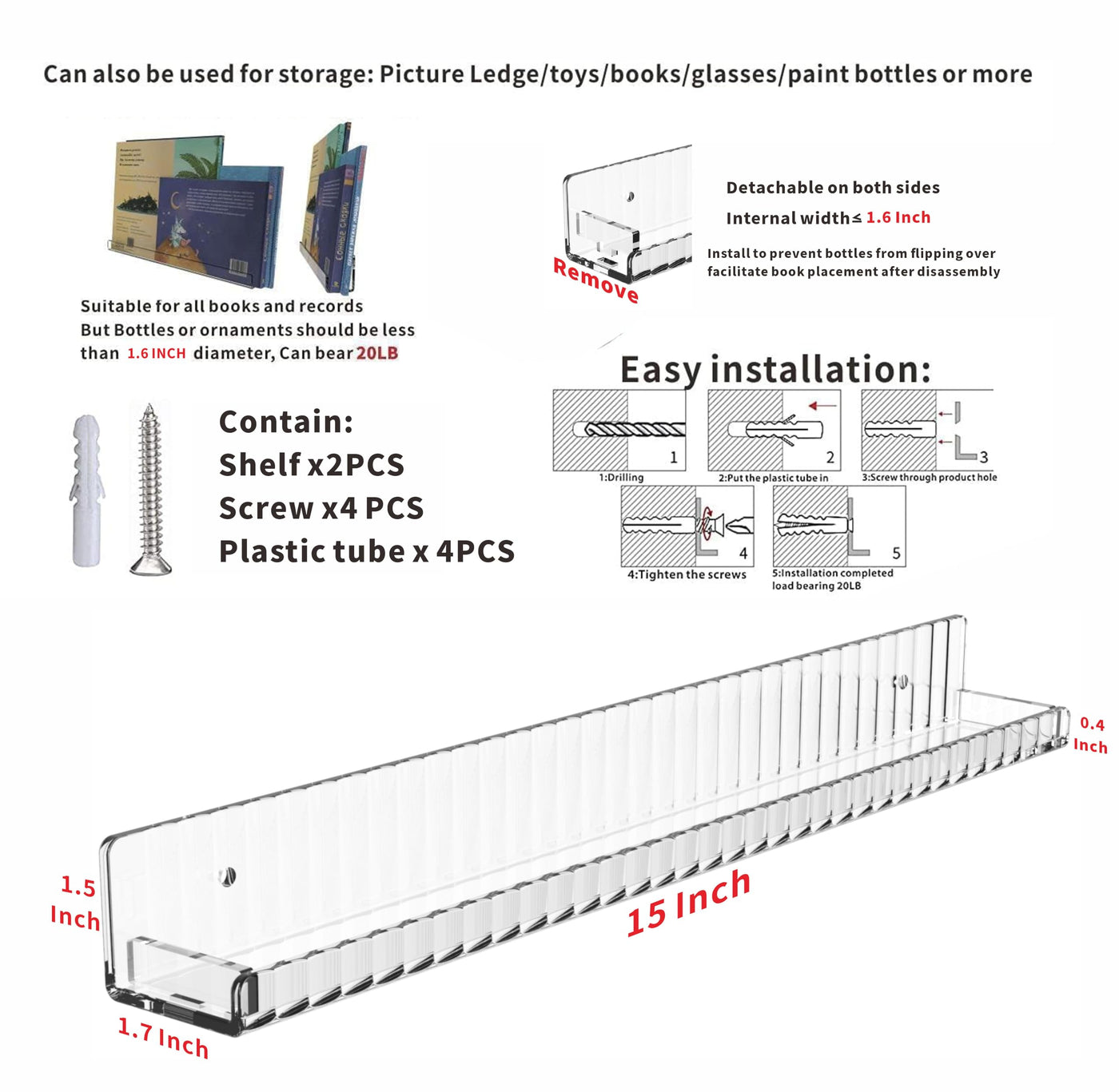 Cq Acrylic 2 Pack Acrylic Clear Floating Bookshelf For Kids Room,15' Invisible Wall Mounted Hanging Book Shelves,U Modern Picture Ledge Display Toy Storage Vinyl Record Wall Shelf,Clear