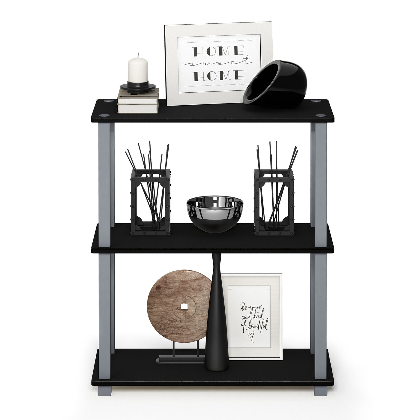Q: How much weight can each shelf hold?A: Each shelf can hold up to 20 lbs, making it suitable for a variety of items including books, decor, and storage boxes.