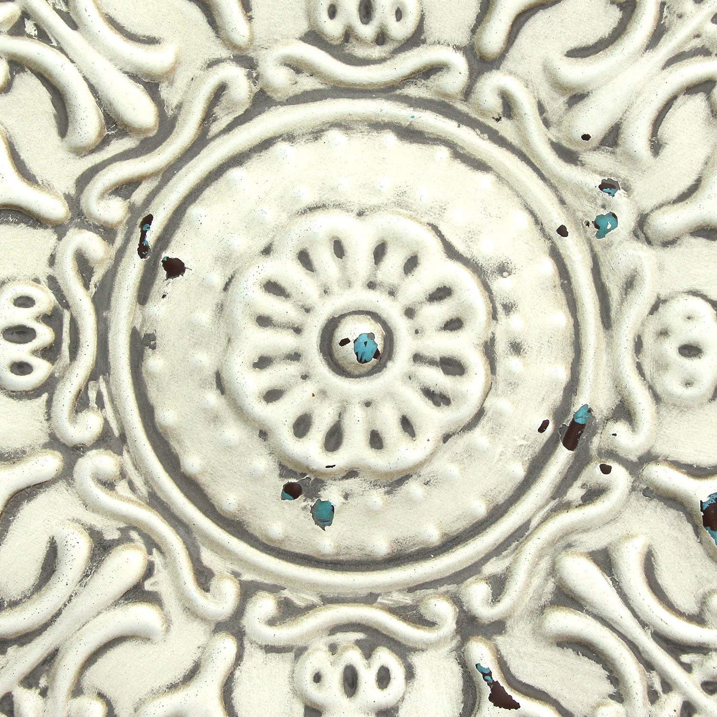 Rejig the decor of your living room or dining room with this distressed white medallion wall decor to create an exciting, visual vibe. Our wall art is artfully handcrafted of metal to spice up the look of your living space. It features a stunning ornamental design with a touch of distressed white finish to make it a perfect accent on any wall background. ' Rustic style ' Handcrafted of metal 'Keyhole hanging method ' Vertical hanging orientation ' Wipe clean with damp cloth. It is 13" X 0.5" X 13".