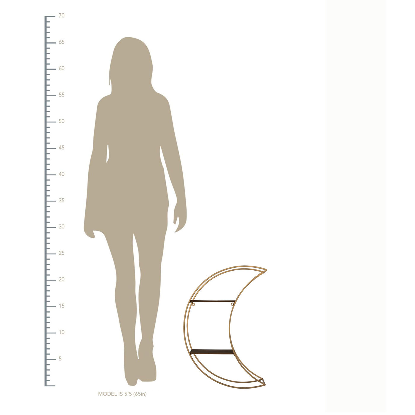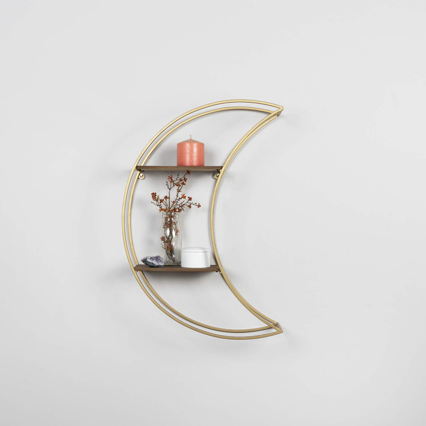 Bring home this aesthetically structured Gold Half Moon Floating Shelf to embellish the interior of your home. Minimalistic in design yet efficiently functional, this sophisticated floating shelf flaunts a crescent moon structure in a matte gold finish with two medium-stained wooden panels. Besides being a sophisticated decorative accent on the bare walls, this unique piece will maximize wall space to store decorative items, souvenirs, plants, or books to keep your home more organized. Built with durability in mind, this floating shelf is expected to last for many years as it is made of 40% wood and 60% metal. If you need a classy addition that fits in with your modern décor, this floating shelf is just the perfect piece to transform your interior. 23â? x 16â? x 5â?