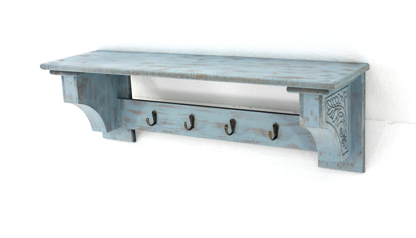 This wooden wall shelf comes with winning style to brighten your home setting with elegance and warmth. It is properly crafted from durable wood with heavily distressed blue finish. It features a pair of elegant supports and four metal hooks that are useful for hanging your handbags, keys, hats or jackets. All this features together with a slender upper shelf make this masterpiece beautifully inspiring and artfully perfect as an inclusion to your living room, dressing room or office. - Vintage collection ' Four metal hooks ' One slender upper shelf ' Blue finish