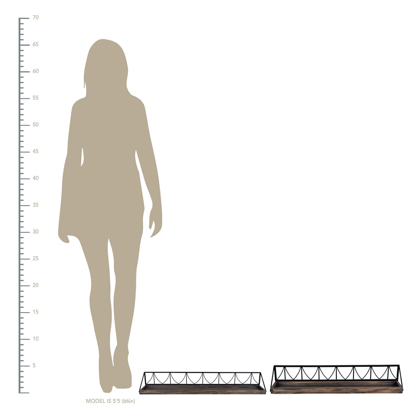 Add a touch of industrial elegance with this Set of Two Wooden Wire Mesh Floating Wall Shelves. This set comes with one big shelf and one small shelf, both made from a mix of wood and metal which makes them sturdy yet light enough to hang securely on your walls. The bases of the shelves are made from wood and have a dark brown varnish on top. At the back of the wooden shelves, there is a bridge inspired metal framing that ends on either side. The simple yet unique style of these shelves are not only great for elevating a simple wall in your home but also provide a great storage solution for the smaller items you may have. You can use these shelves anywhere in your home owing to their neutral colors. 5.25' H x 36.25' W x 5.5' D