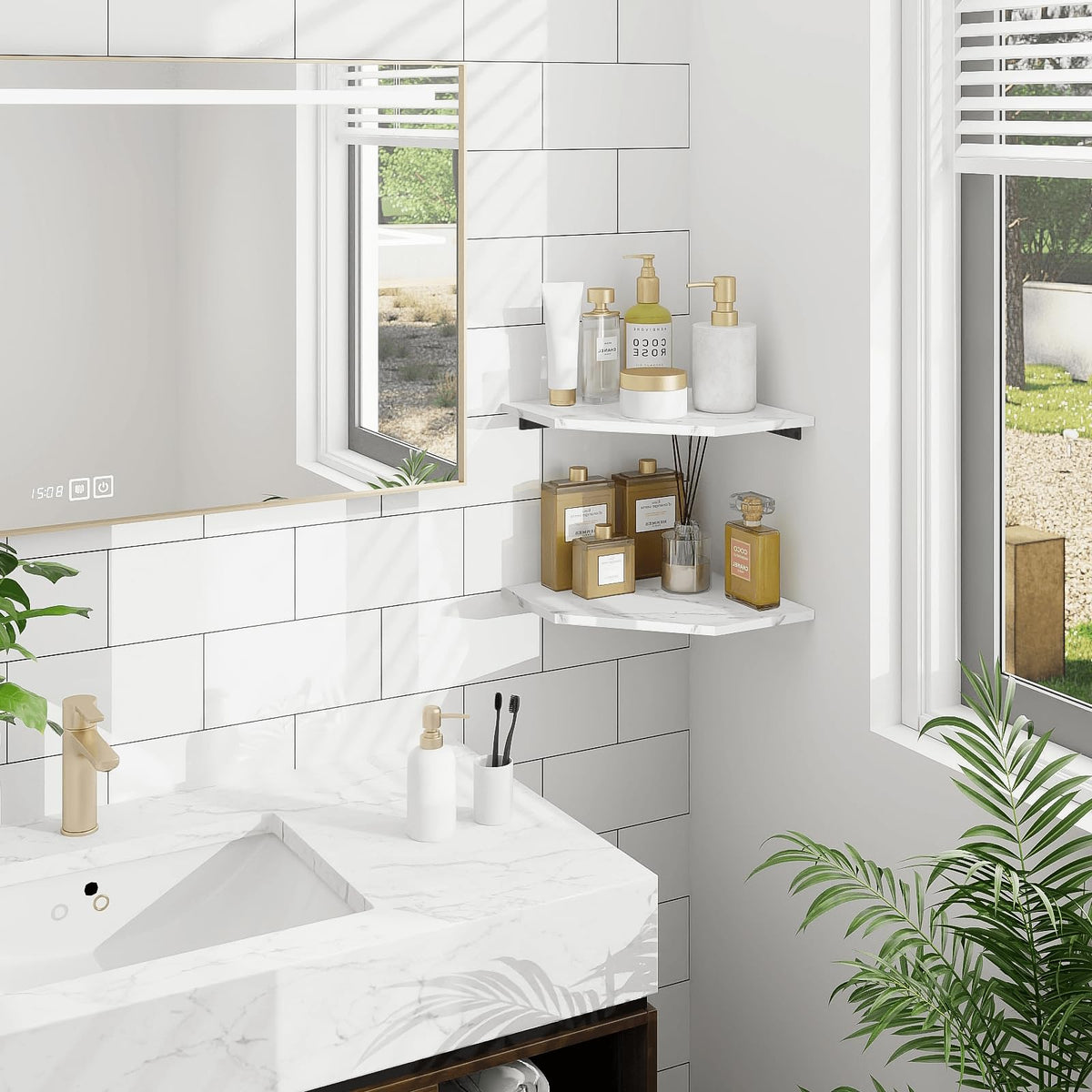 Homode Corner Wall Shelf, Set Of 2 Floating Corner Shelves With Wire Hole, 2 Tier Wooden Hanging Display Shelf For Bathroom Bedroom Kitchen, White Marble