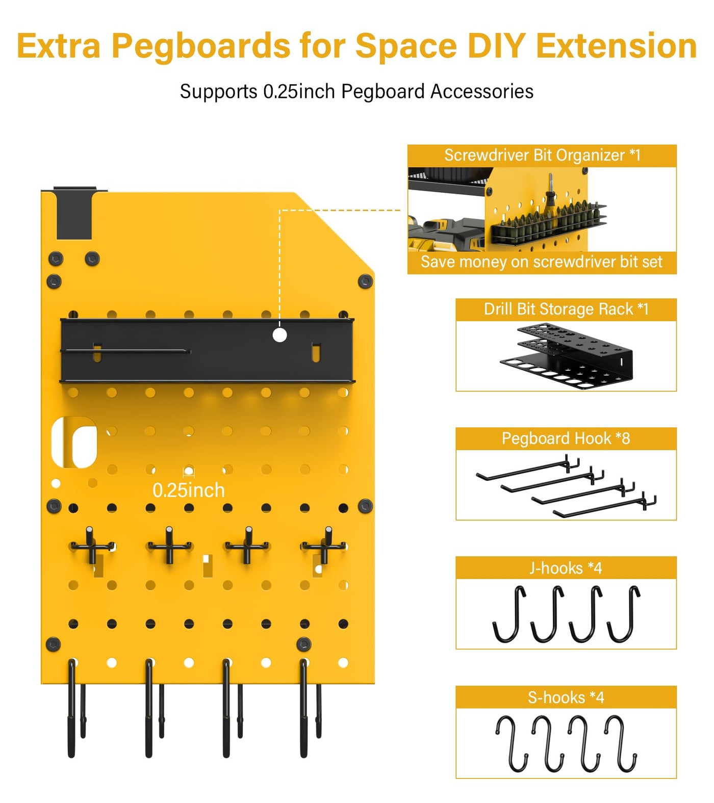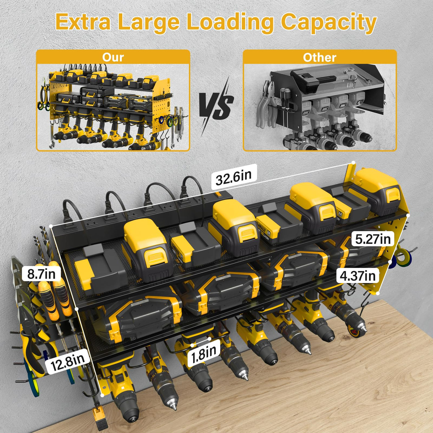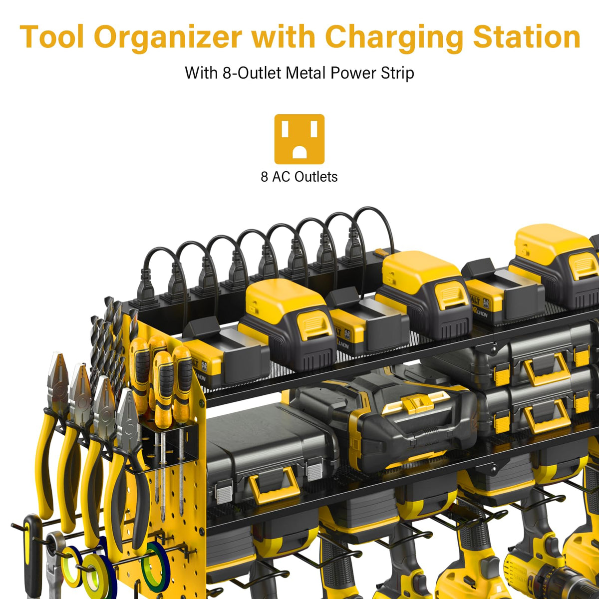 Junnuj Large Pegboard Power Tool Organizer With Charging Station, 8 Drills Driver And Tools Battery Holder Wall Mount With 8 Outlet Power Strip, Yellow 3-Layer Shop Garage Storage Utility Rack