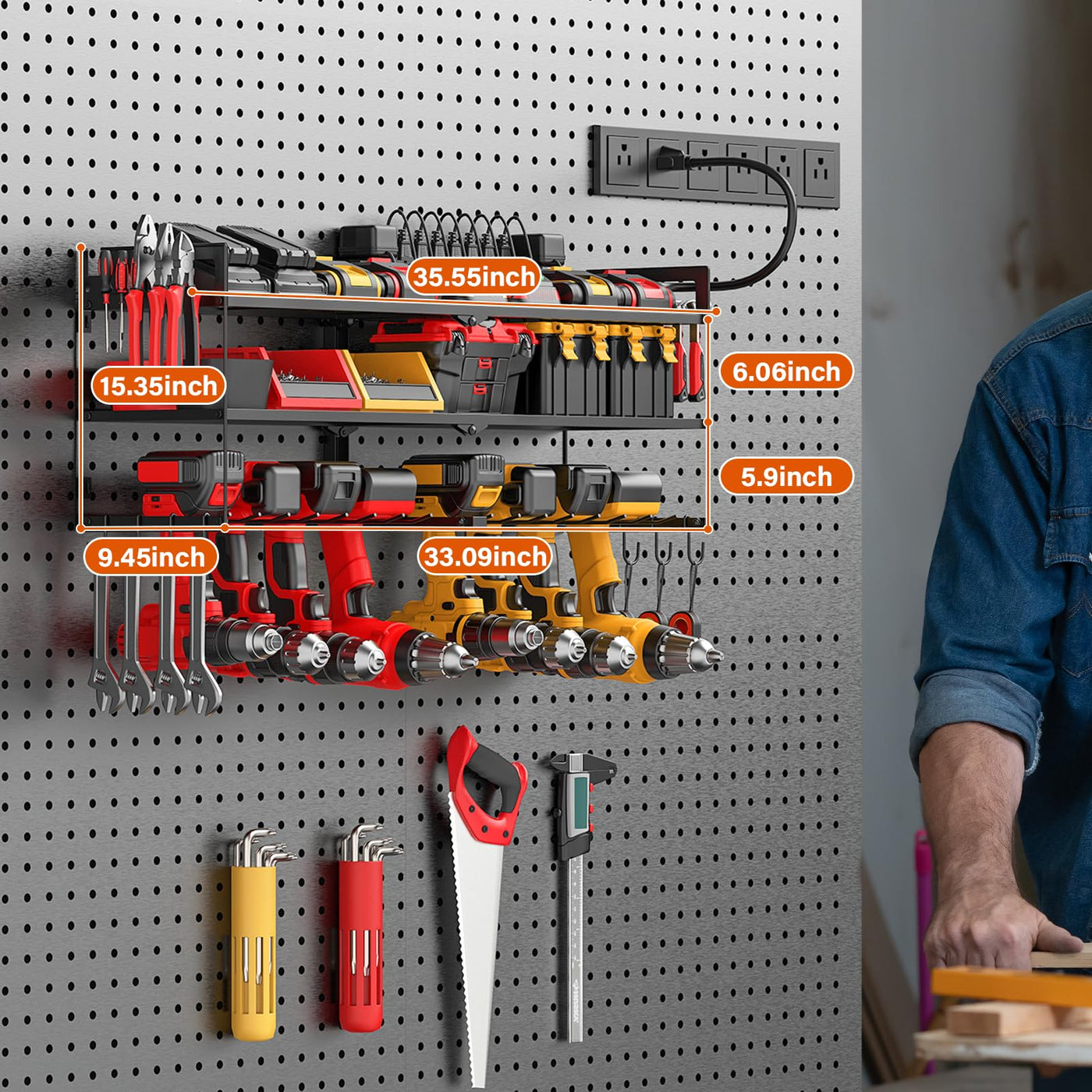 Large power tool organizer with charging in one, it is dedicated to providing an organized and efficient workspace for you. Tool organizer with 10 outlet power strip, three-tier large capacity design allow to store 8 drills on the bottom tier, batteries, chargers and other tools on the top three tiers, pliers holder are added to the side. Two side pegboard extension comes with 8 long hooks. | Our power tool drill and battery organizer innovatively features 10 AC outlets allowing to power up to 10 devices, reserved 2 widely spaced outlets to plug large plugs. Comes with a 6-foot extension cord for flexible connection to the distant outlets. Save the cost of purchasing additional power strip. | This tool shelf for handheld power tools wall mounted toolholder will be a perfect gift idea for those who love DIY and getting things organized. Besides the power tool storage rack, this lower tier rack can also be used to hang tools such as rubber mallets or drilling hammers. | This wall mount tools battery holder features a three-tier, large capacity design with storage space, shelf height that offers more space than other tool racks, 6.06 inch mid-tier tool rack for more charging posts, batteries, and added pliers holders, drill bit storage on the side. Size: 35.55*9.45*15.35 in. | Easy to assemble and hang, it only takes a few minutes to assemble the perfect heavy duty tool holder. The large tools holder made of reinforced and thickened high-quality iron, with strong bearing capacity and durability. Each layer of the grid can support a maximum weight of 66IB. The tools in the picture are only used to show capacity and are not included.