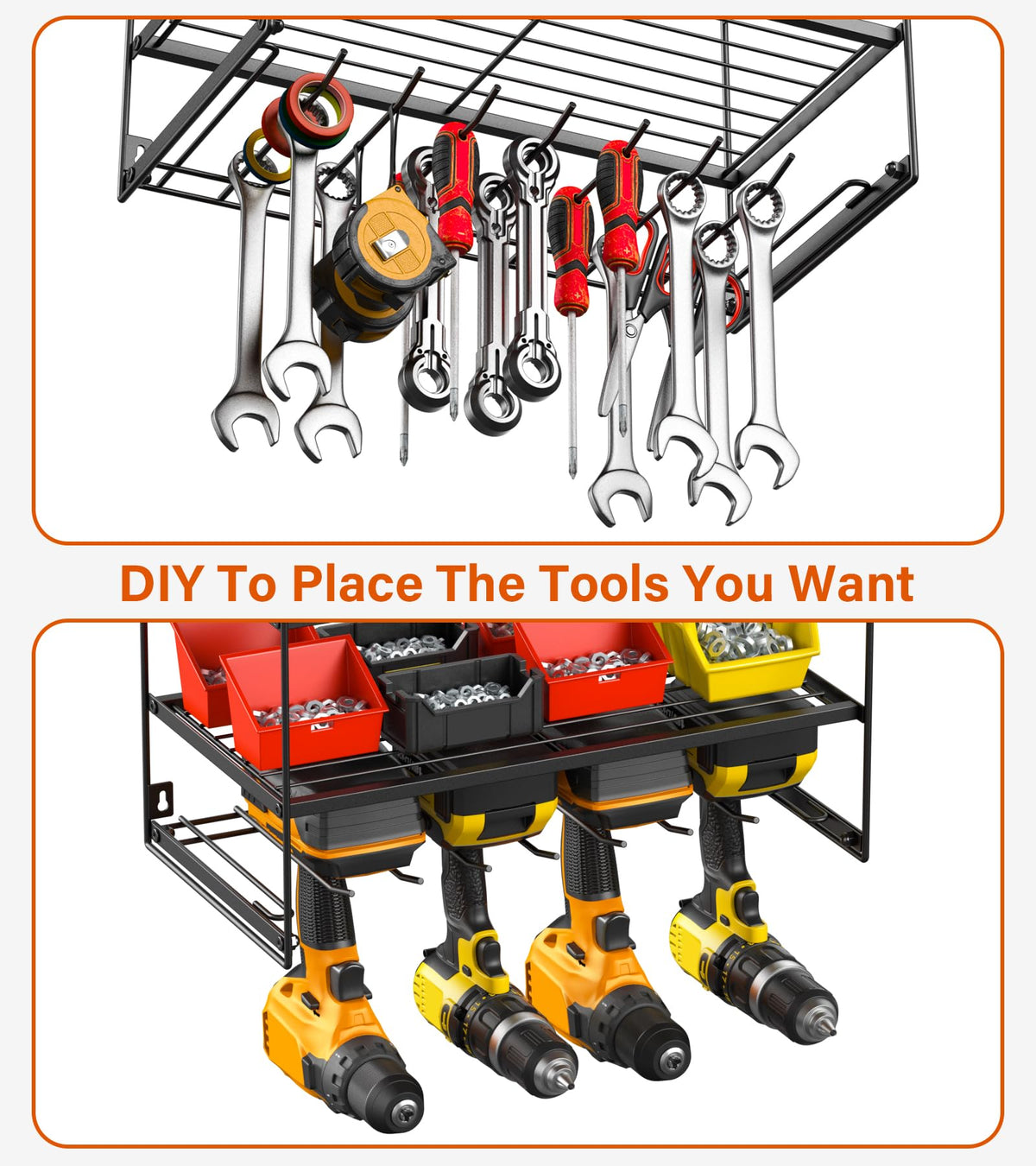 Junnuj Power Tool Organizer With 10 Outlet Power Strip, 4 Layer Wall Mount Drill Holder With Charging Station, 4 Drills Storage Shelf Shop Garage Utility Rack, Black