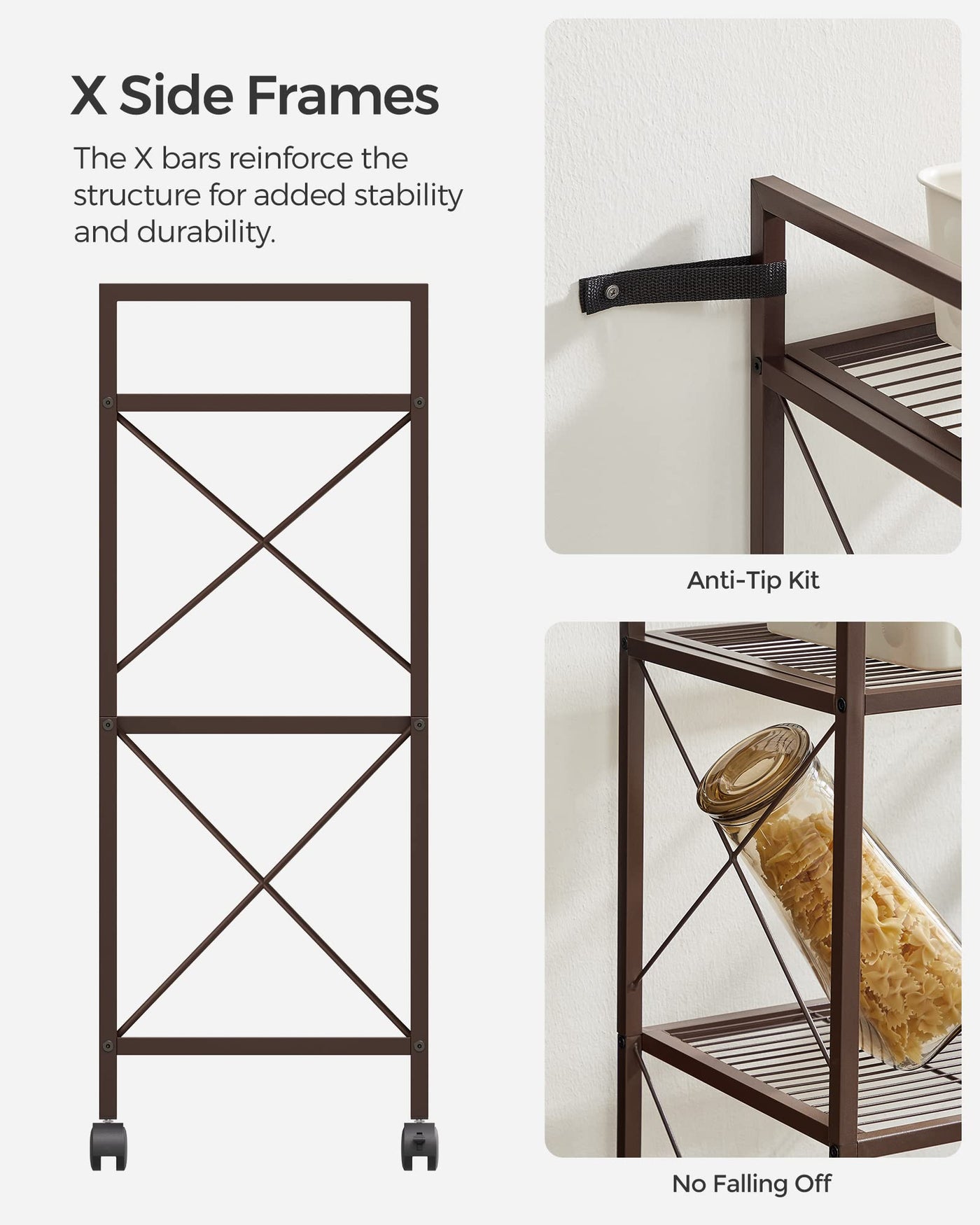 Songmics 3-Tier Metal Storage Rack With Wheels, Mesh Shelving Unit With X Side Frames, 23.6-Inch Width, For Entryway, Kitchen, Living Room, Bathroom, Industrial Style, Metallic Bronze Ubsc163A01