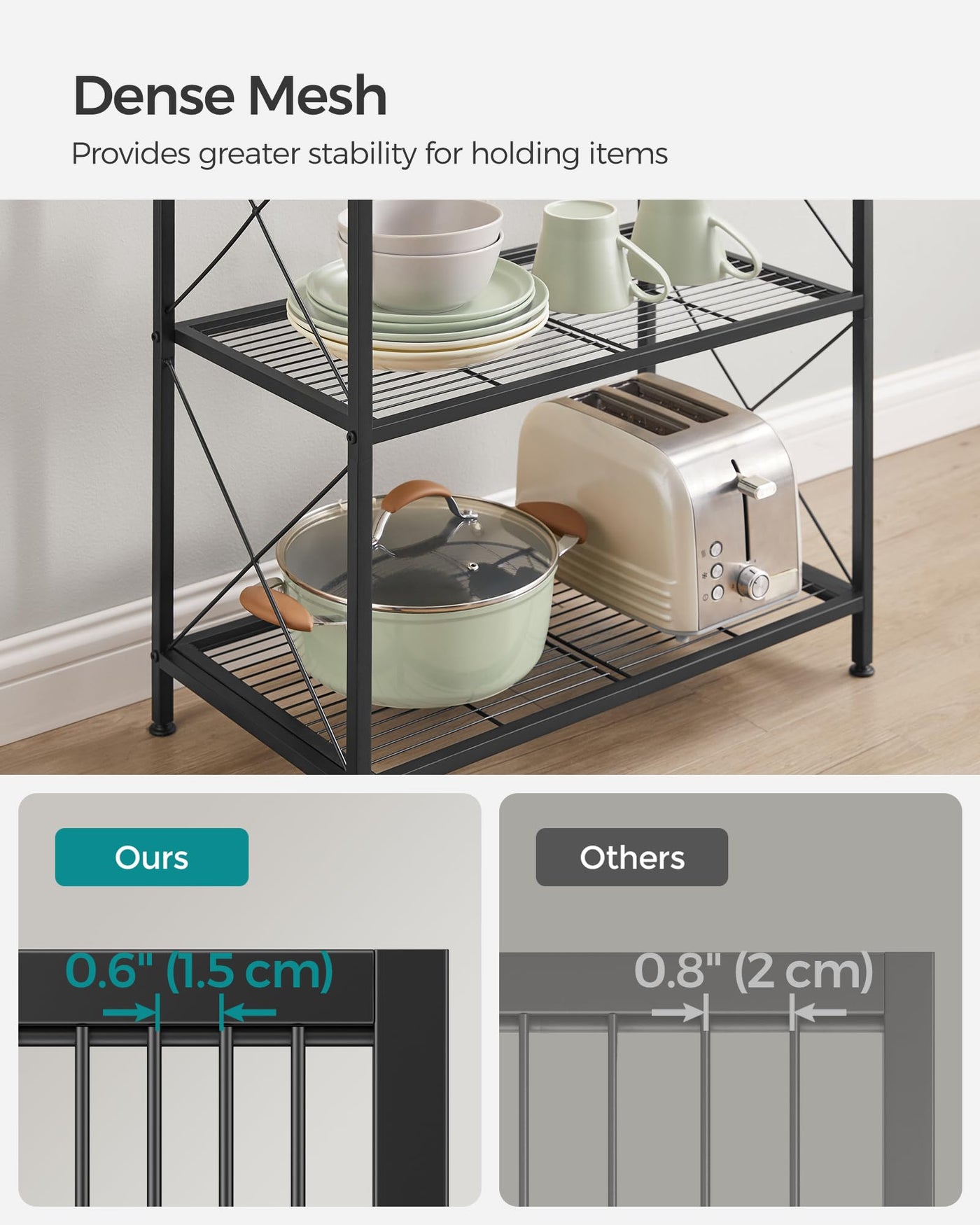 Looking for a storage solution for your entryway, living room, kitchen, or bedroom? Check out this 4-tier storage rack! Highlights of This 4-Tier Shelving Unit: - Solid structure: The robust steel frame with reinforced X bars holds your items stably and firmly. - Dense mesh: 0.6' spacing holds even smaller items and provides greater stability for supporting items. - Adjustable feet: Keep the metal rack stable on slightly uneven floors and protect your floor from scratches. - Easy assembly: Numbered parts and easy-to-follow instructions for easy assembly. Specifications: - Color: Ink Black - Material: Steel - Product Size: 12.6'D x 23.6'W x 44.3'H (32 x 60 x 112.5 cm) - Product Weight: 12.3 lb (5.6 kg) - Max. Static Load Capacity per Shelf: 110 lb (50 kg) - Total Max. Static Load Capacity: 440 lb (200 kg) Package Contents: - 1 x 4-Tier Storage Rack - 4 x Adjustable Feet - 1 x Anti-Tip Kit - 1 x Accessory Kit - 1 x Instructions SONGMICS Notes: - Please secure the storage rack to the wall with the provided anti-tip kit. - Do not exceed the weight limit of the mesh shelves.