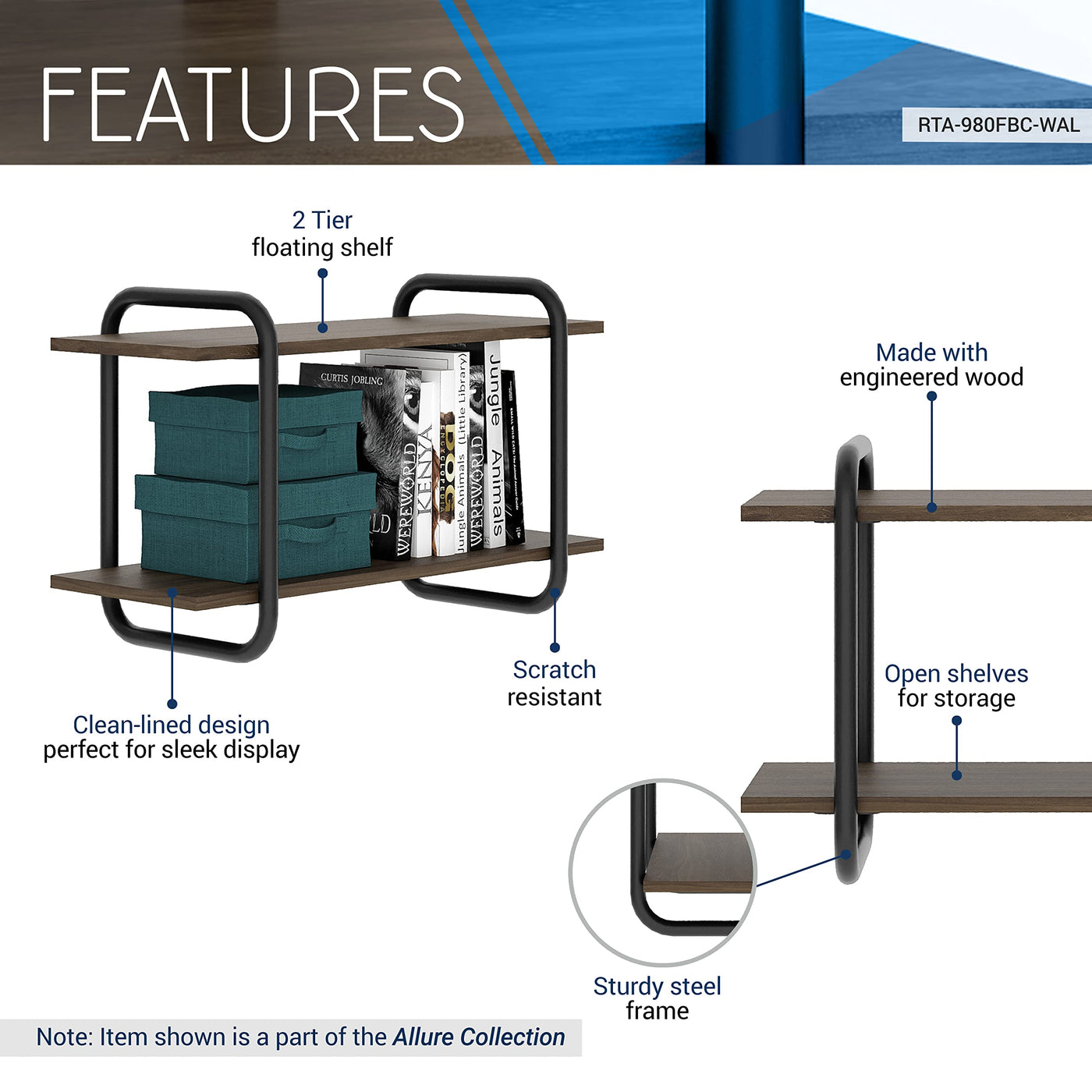 The Techni Mobili Modern Floating Wall Shelves Creates A Stylish Storage Design That Can Display Books, Kitchenware, Decorative Pieces, Plants Or Whatever Your Heart Desires. This Item Is Sold Separately Or As Part Of The Allure Collection Set. It Is Made With A A Sleek Black Steel Frame With 2-Tier Shelves That Will Add Elegance And Industrial Style To Any Home. Available With 2 Colors Option Panels, One Walnut And The Other In Solid White. These Shelves Are Made Of Painted Surface Engineered Wooden Materials.