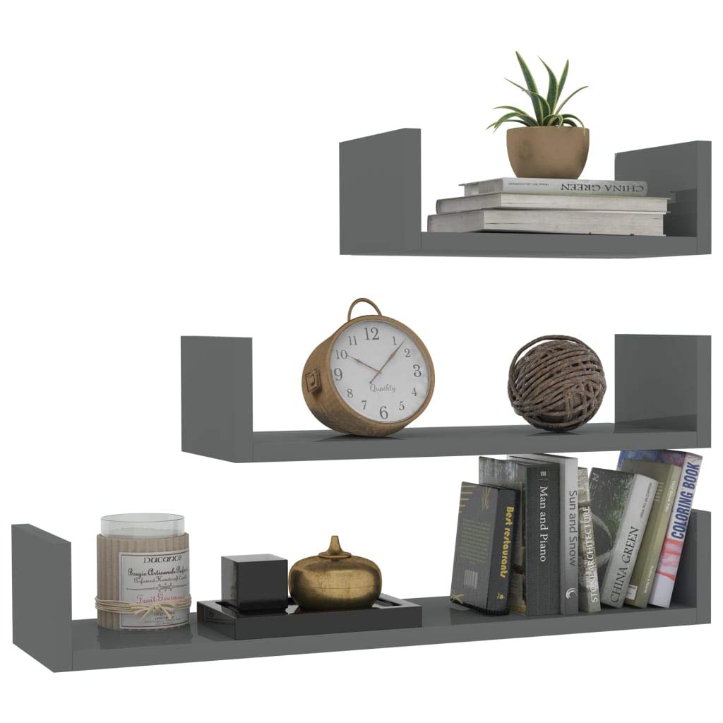 vidaXL Modern High Gloss Gray Wall Display Shelves Set of 3 - Durable Engineered Wood Construction, Stylish & Functional, Great for Kitchen, Living Room, and Bedroom