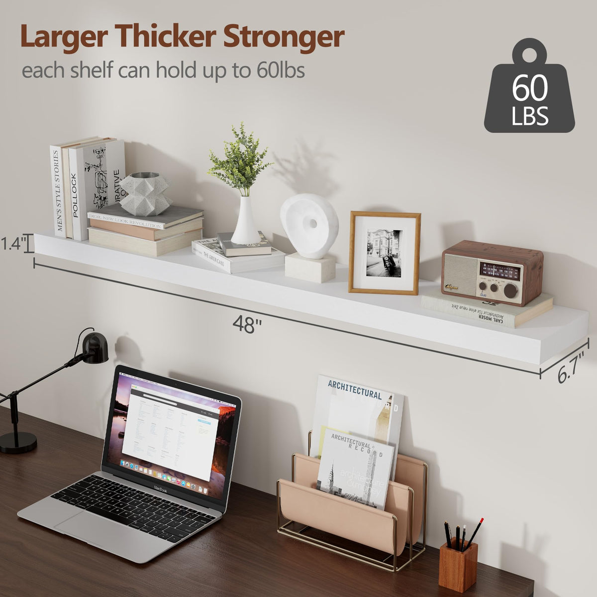 White Floating Shelves 48 Inch Set Of 2, Solid Wood Wall Mounted Shelves 48 Inches Long, Modern Floating Shelves For Bedroom Living Room Bathroom - White