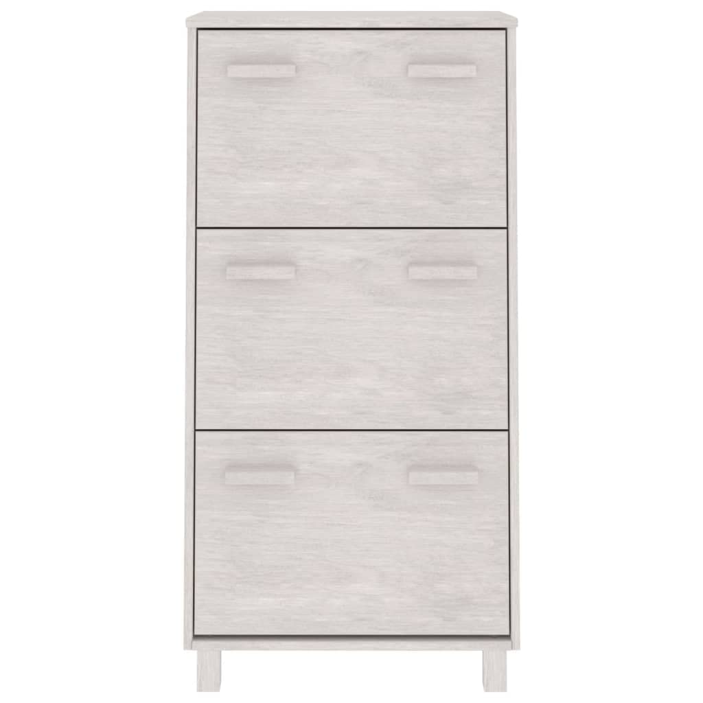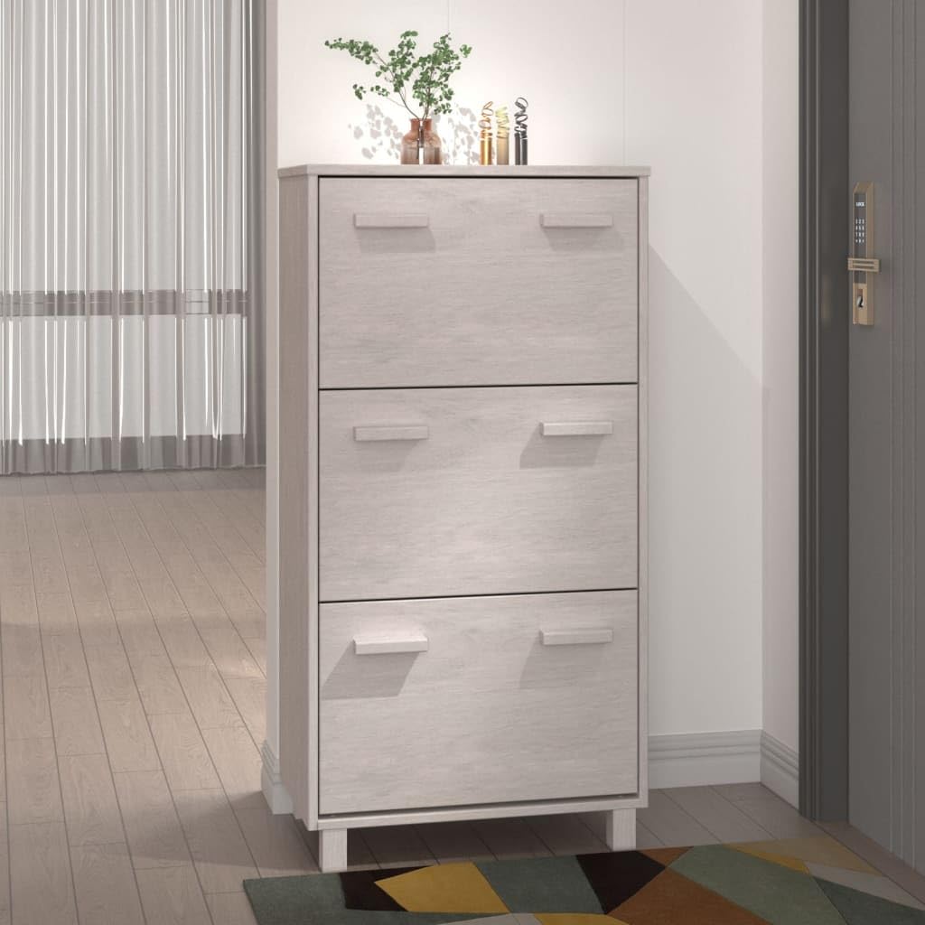 vidaXL Shoe Cabinet HAMAR in White - Solid Pinewood Construction, 3 Flip-Drawers, Clutter-Free Organizer, Meets California Proposition 65 Standards for Safety.