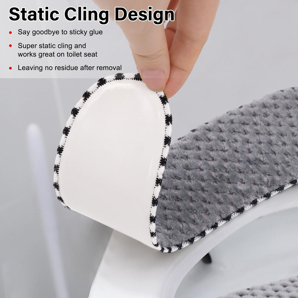 Q: How does the static cling feature work?A: The static cling design allows the toilet seat cover to attach directly to the toilet seat without any adhesive. Simply peel off the protective film, and it will securely stay in place without damaging your toilet ring.