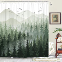 Accnicc Green Misty Forest Shower Curtain Set Ombre Sage Green White Waterproof Fabric Shower Curtains Nature Tree Mountain Wood