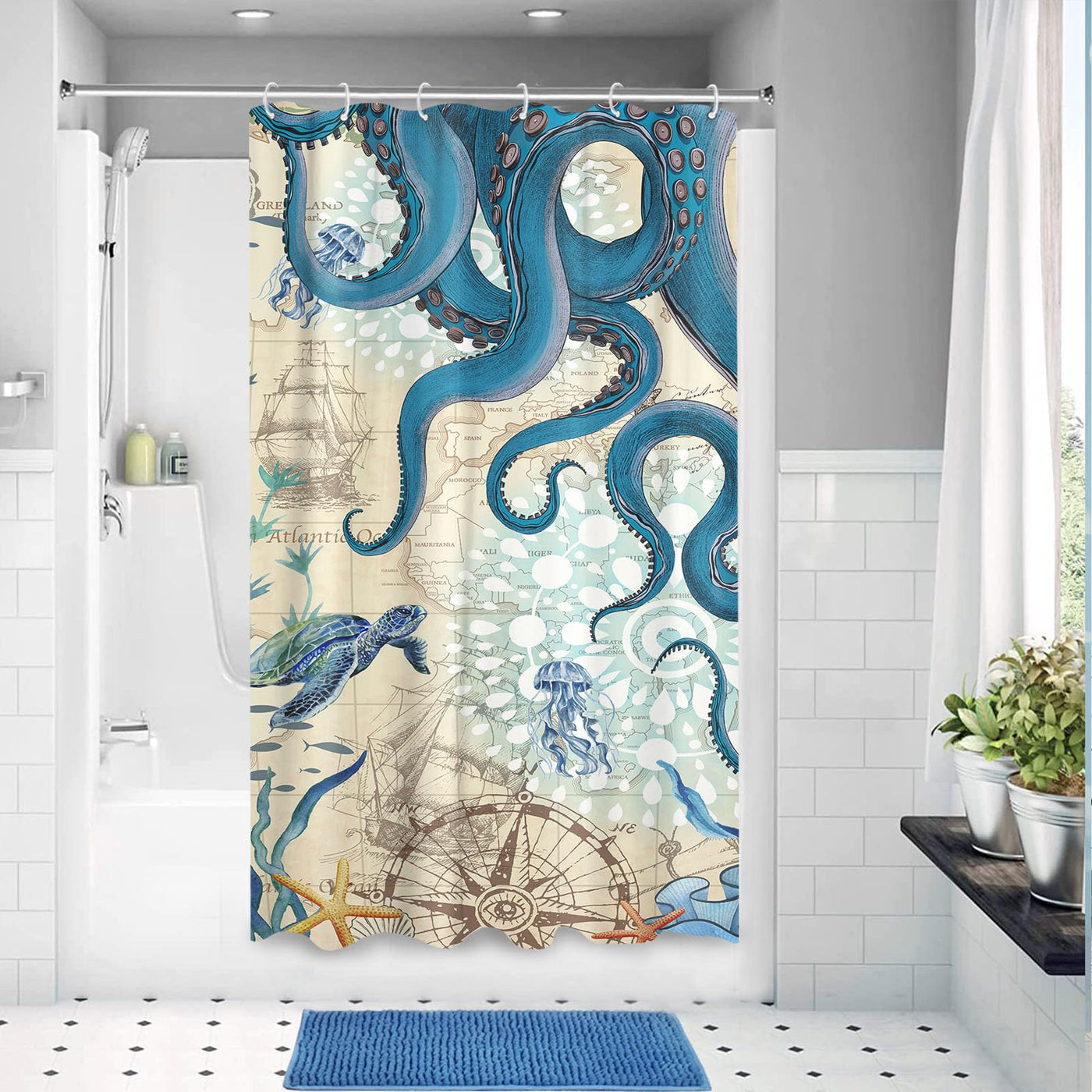 Aipon Nautical Octopus Shower Curtain Ocean Sea Turtle Beach Coastal Blue Fish Seashell Jellyfish Theme Waterproof Fabric Shower