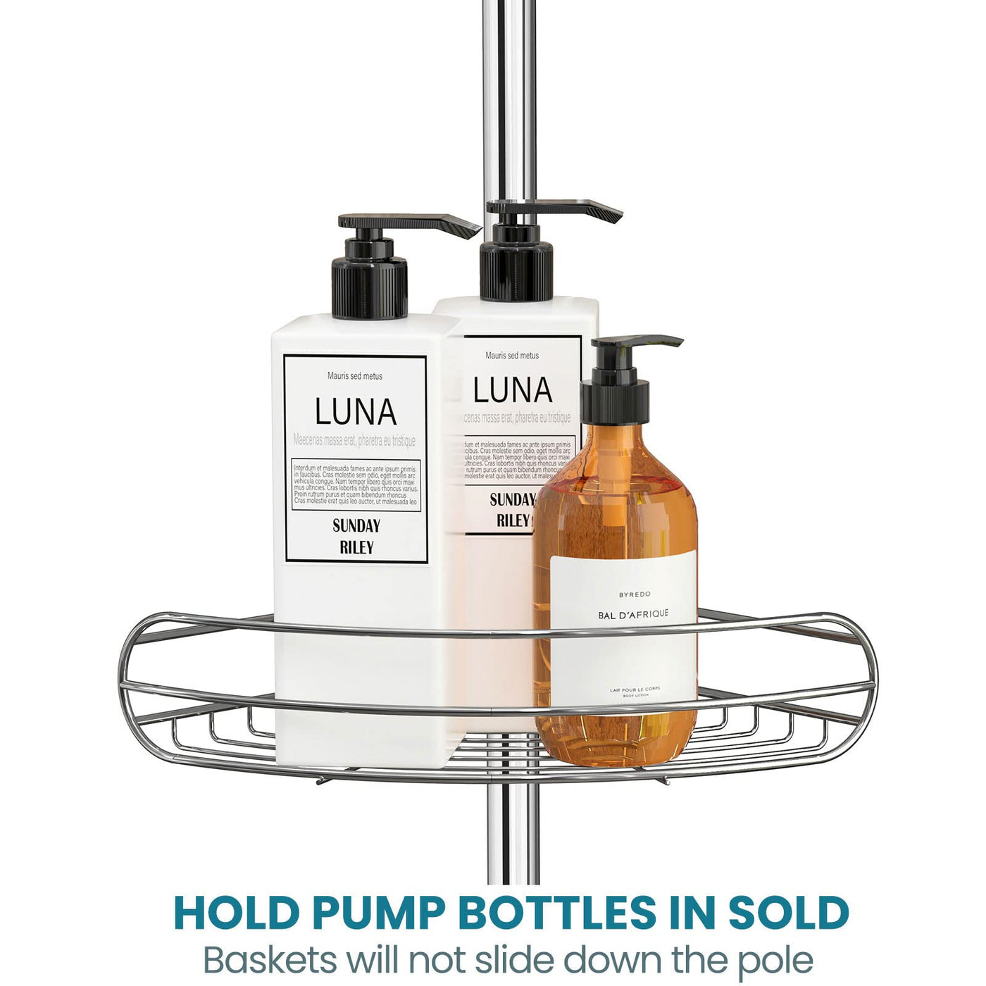Q: How many items can the shelves of the shower caddy hold?A: Each of the 4 large shelves on the ALLZONE Corner Shower Caddy can hold 2-3 large 32 oz pump bottles or 4-5 16 oz bottles. This makes it an ideal organizer for your bath supplies like shampoo, conditioner, and body wash.