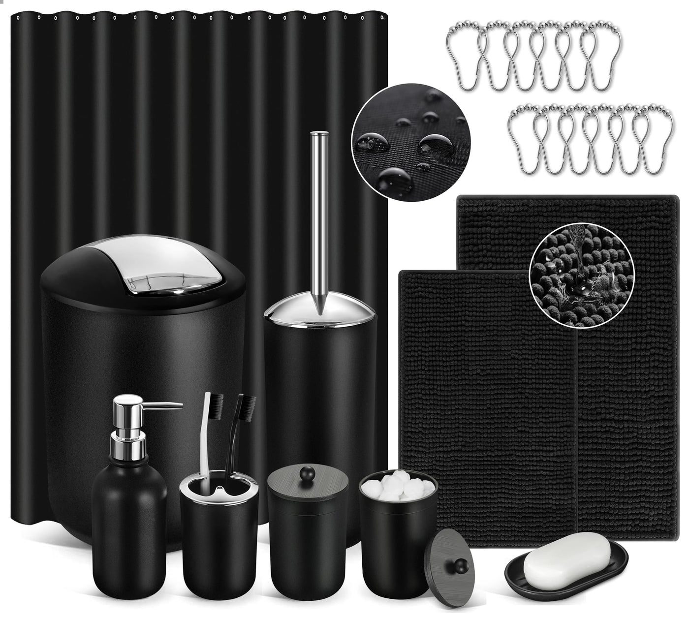 Q: What is included in the ALPIRIRAL Black Bathroom Accessories Set?A: The ALPIRIRAL Black Bathroom Accessories Set includes a complete 22-piece collection featuring a shower curtain (71"L x 71"W) with 12 hooks, 2 super absorbent bathroom rugs, a trash can, a soap dispenser, a soap dish, a toothbrush holder, a toilet brush with holder, and 2 qtip holders.