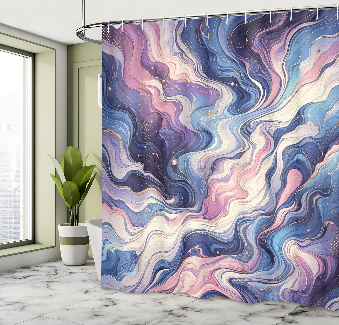 Q: How does the design of this shower curtain stand out?A: The Ambesonne shower curtain features a unique oil paint-like marble print with warm deep tones, providing a distinctive and artistic decor option that is not commonly found in other shower curtains.