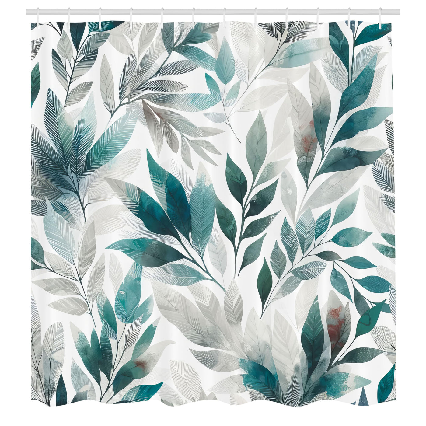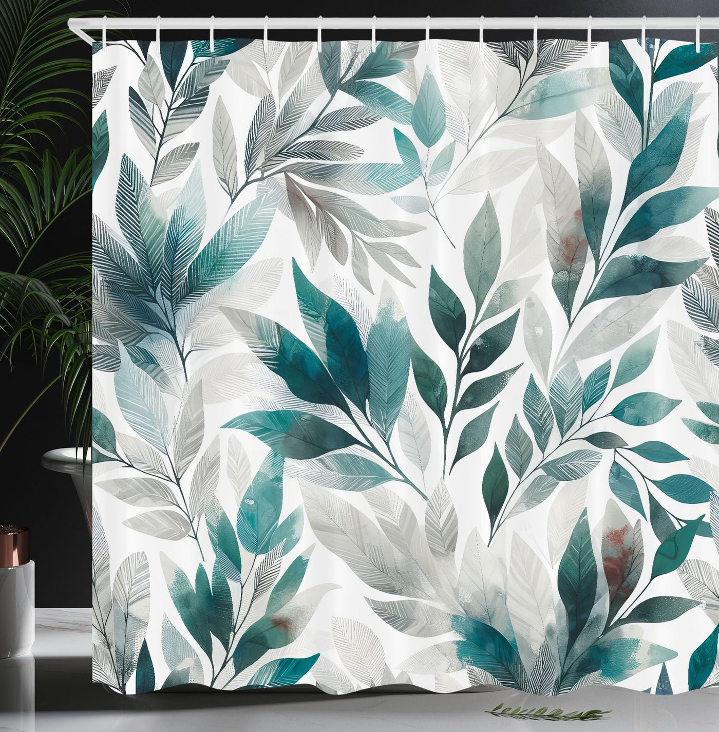 Ambesonne Teal Shower Curtain, Urban Jungle Theme Phantom Of Leaves Greenery On Plain Back Dreamy Exotics, Cloth Fabric Bathroom