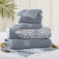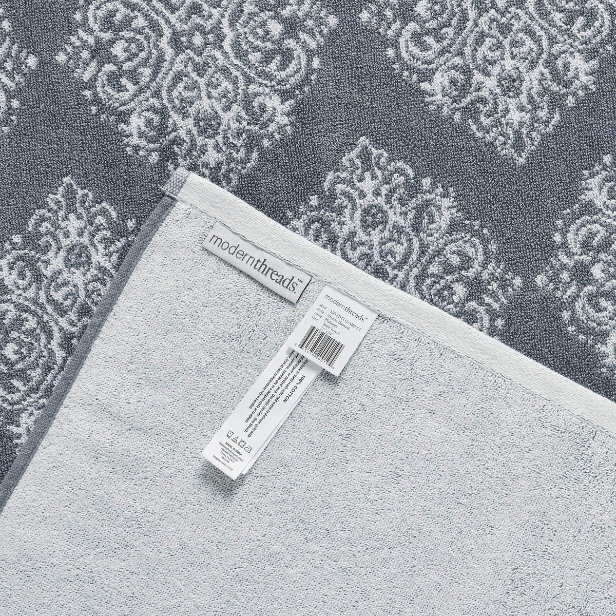 Q: What materials are used in the Modern Threads Artesia Damask Towel Set?A: The Modern Threads Artesia Damask Towel Set is made from 100% combed cotton, ensuring a soft and absorbent feel.