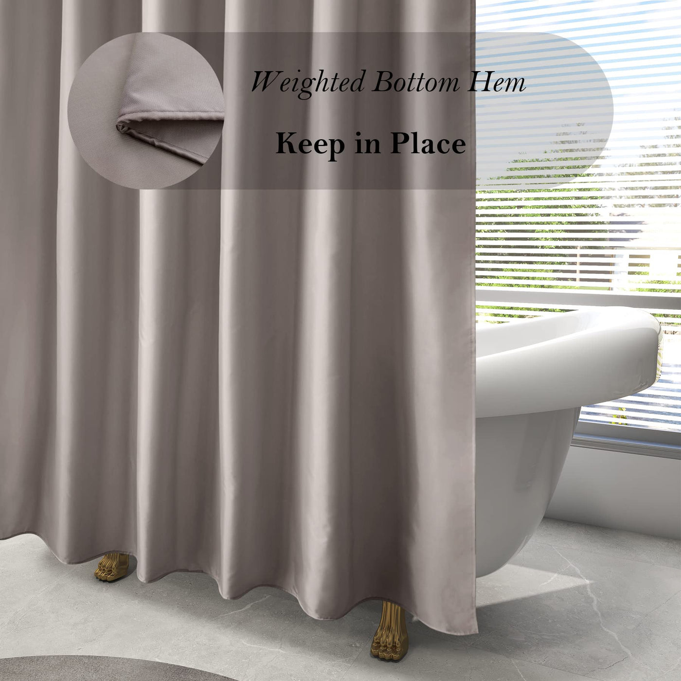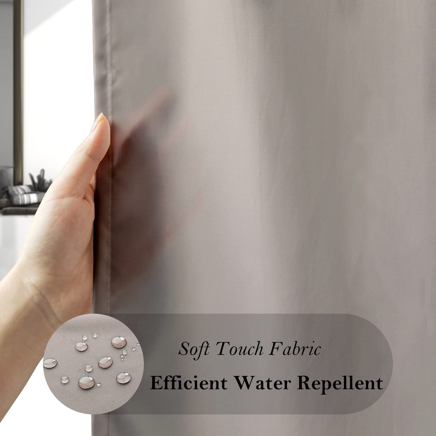 Q: Is the shower curtain water repellent?A: Yes, this shower curtain is made from water-repellent fabric, which helps prevent water from soaking through and keeps your bathroom dry.