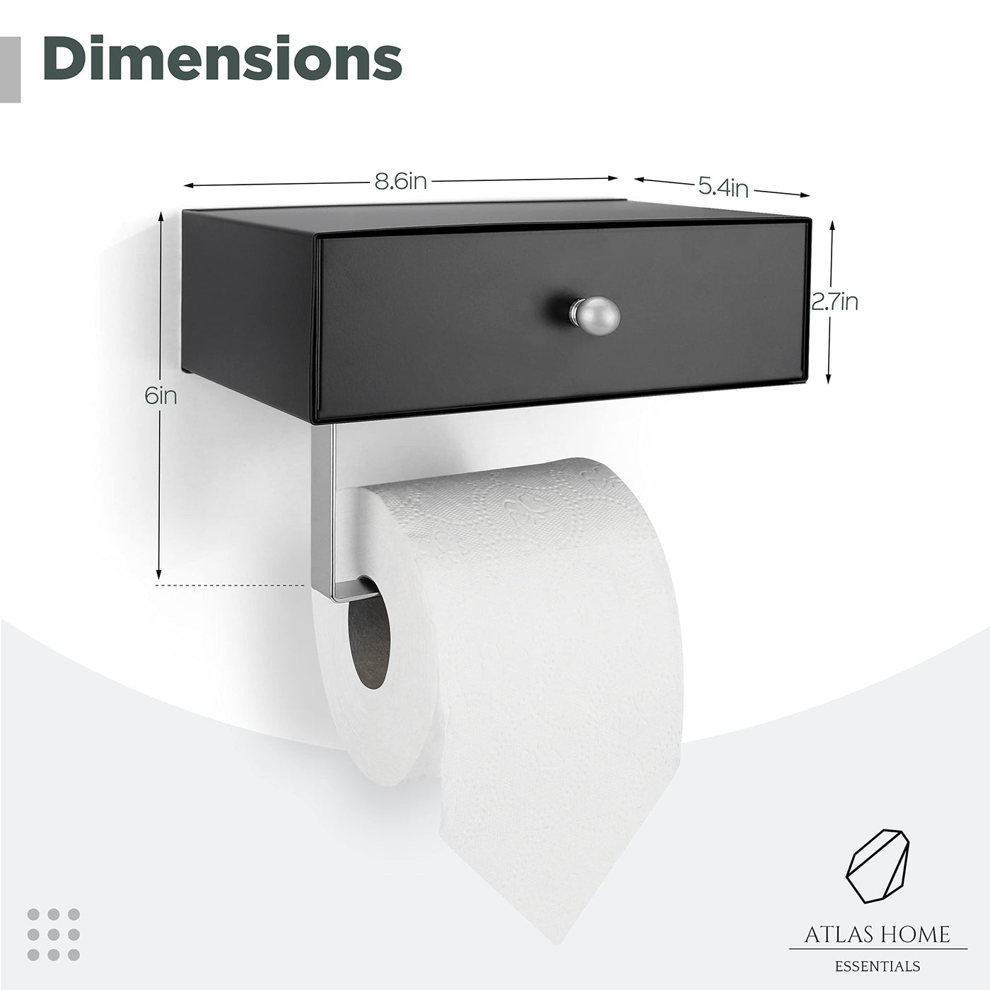Q: What materials is the Atlas Home Toilet Paper Holder made from?A: The Atlas Home Toilet Paper Holder is constructed from durable premium stainless steel with a matte black finish, making it resistant to rust and corrosion.