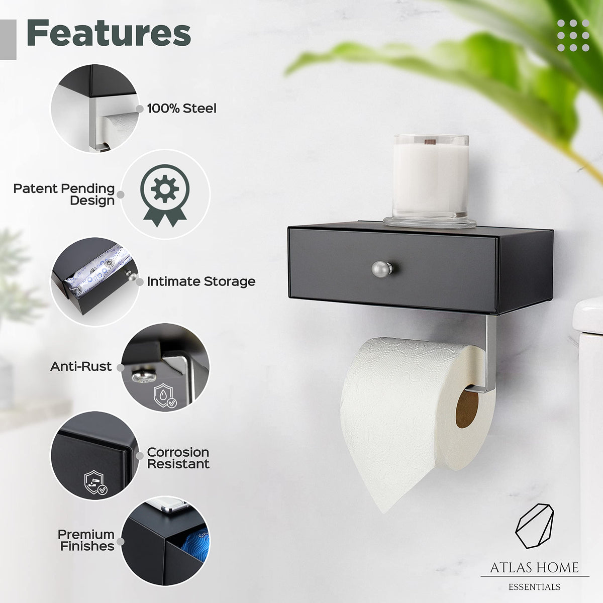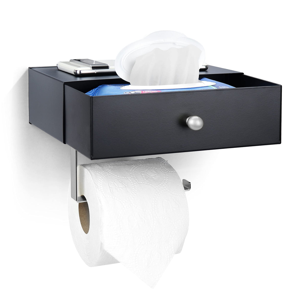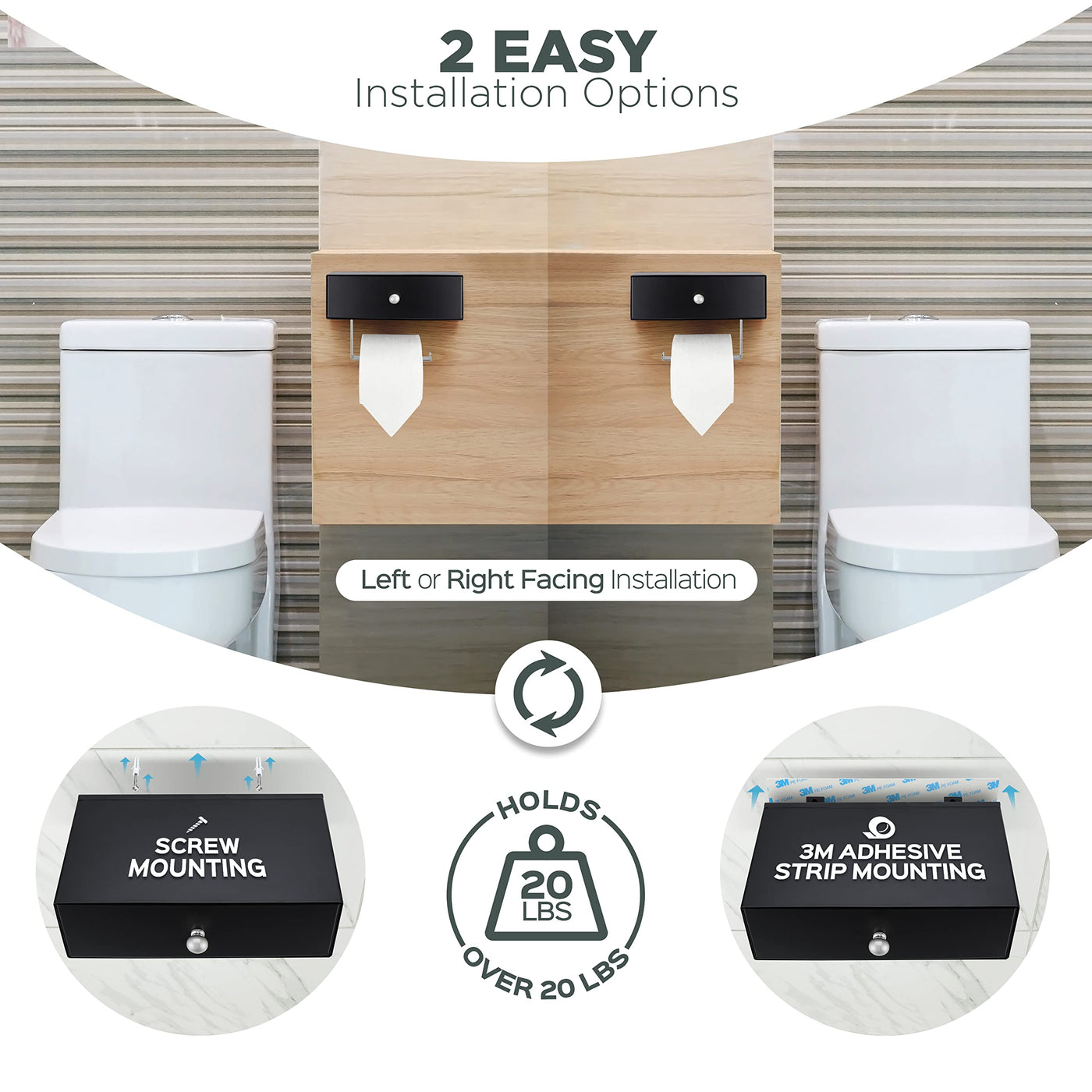 Q: What is the purpose of the shelf on the toilet paper holder?A: The built-in shelf is designed to discreetly store flushable wipes, feminine products, or other private bathroom essentials, helping to keep your bathroom organized and clutter-free.